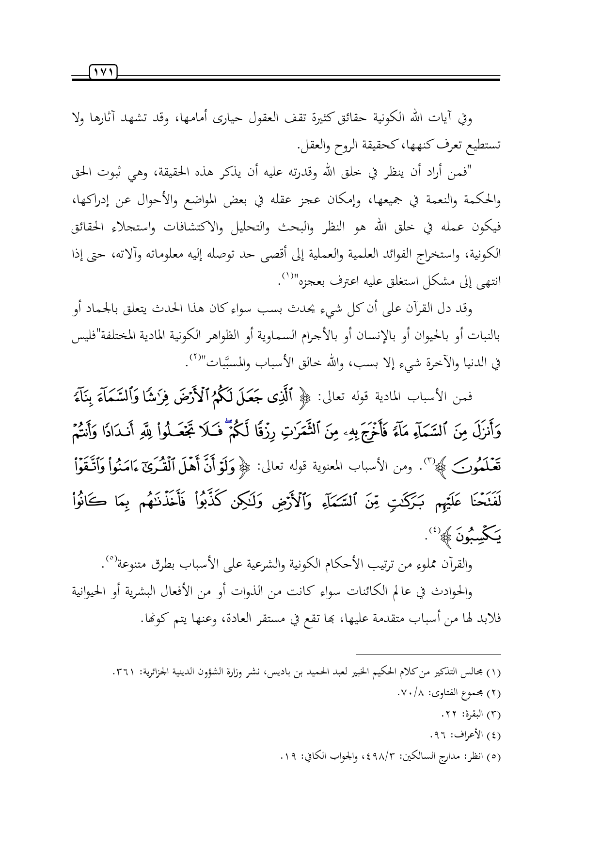 والقرآن مملوء من ترتيب الأحكام الكونية والشرعية على الأسباب بطرق متنوعة (¬5).