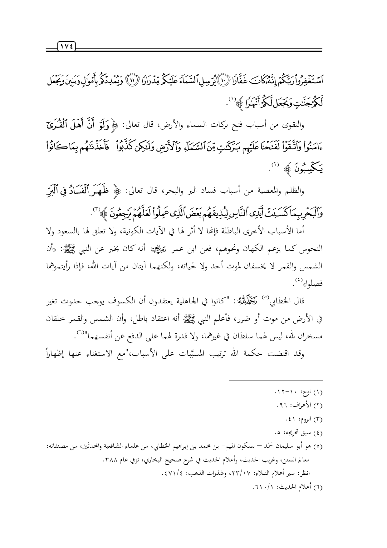 أما الأسباب الأخرى الباطلة فإنها لا أثر لها في الآيات الكونية، ولا تعلق لها بالسعود ولا النحوس كما يزعم الكهان ونحوهم، فعن ابن عمر -رضي الله عنهما- أنه كان يخبر عن النبي -صلى الله عليه وسلم-: «أن الشمس والقمر لا يخسفان لموت أحد ولا لحياته، ولكنهما آيتان من آيات الله، فإذا رأيتموهما فصلوا» (¬4).