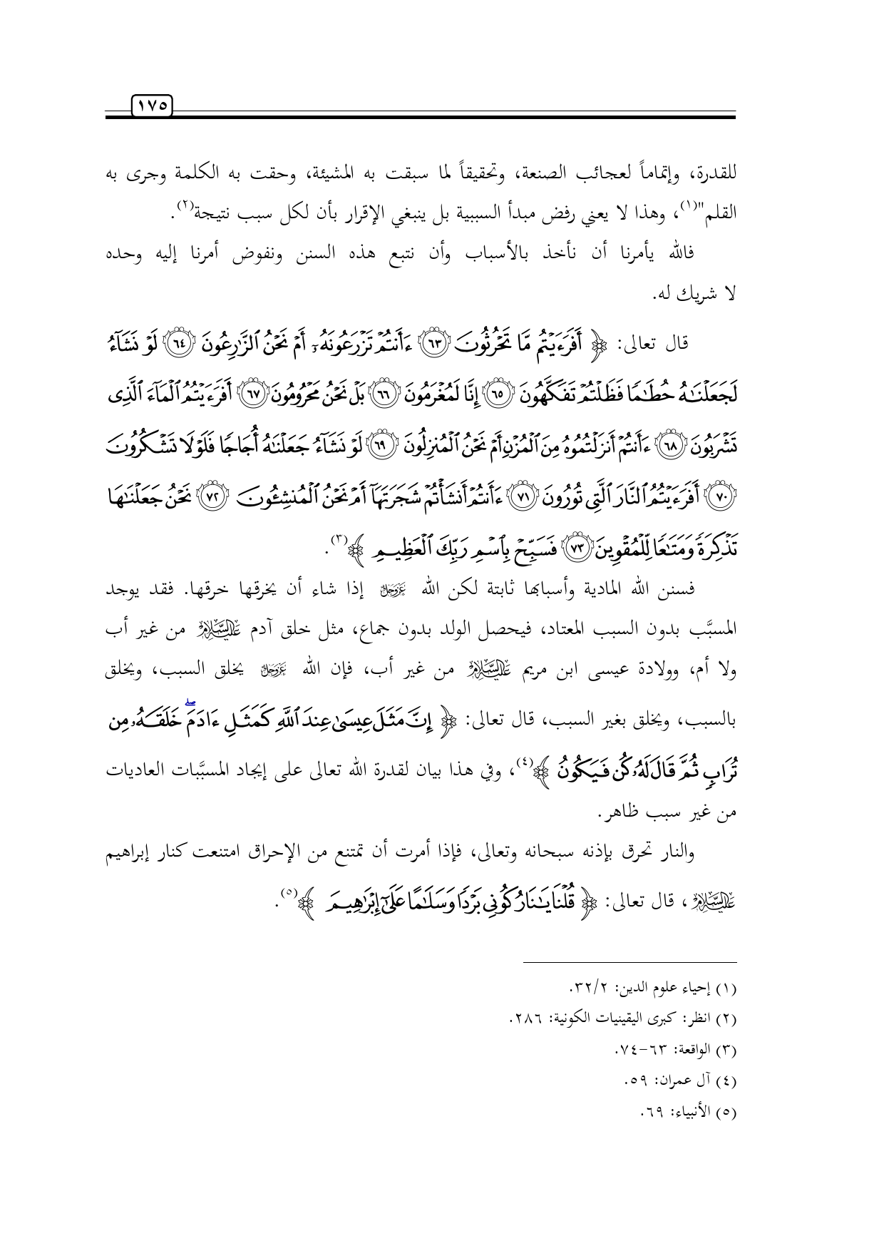 للقدرة، وإتماماً لعجائب الصنعة، وتحقيقاً لما سبقت به المشيئة، وحقت به الكلمة وجرى به القلم" (¬1)، وهذا لا يعني رفض مبدأ السببية بل ينبغي الإقرار بأن لكل سبب نتيجة (¬2).