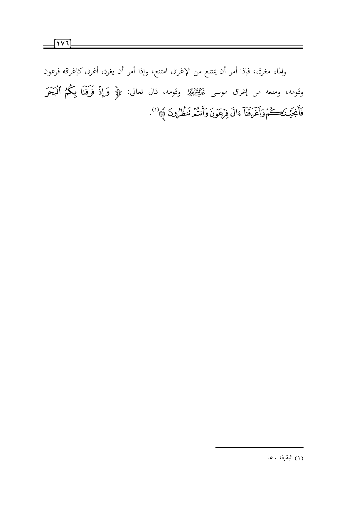والماء مغرق، فإذا أمر أن يمتنع من الإغراق امتنع، وإذا أمر أن يغرق أغرق كإغراقه فرعون وقومه، ومنعه من إغراق موسى -عليه السلام- وقومه، قال تعالى: {وَإِذْ فَرَقْنَا بِكُمُ الْبَحْرَ فَأَنْجَيْنَاكُمْ وَأَغْرَقْنَا آلَ فِرْعَوْنَ وَأَنْتُمْ تَنْظُرُونَ} (¬1).