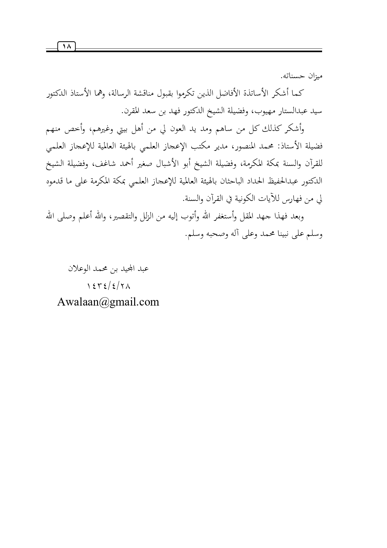 وأشكر كذلك كل من ساهم ومد يد العون لي من أهل بيتي وغيرهم، وأخص منهم فضيلة الأستاذ: محمد المنصور، مدير مكتب الإعجاز العلمي بالهيئة العالمية للإعجاز العلمي للقرآن والسنة بمكة المكرمة، وفضيلة الشيخ أبو الأشبال صغير أحمد شاغف، وفضيلة الشيخ الدكتور عبدالحفيظ الحداد الباحثان بالهيئة العالمية للإعجاز العلمي بمكة المكرمة على ما قدموه لي من فهارس للآيات الكونية في القرآن والسنة.