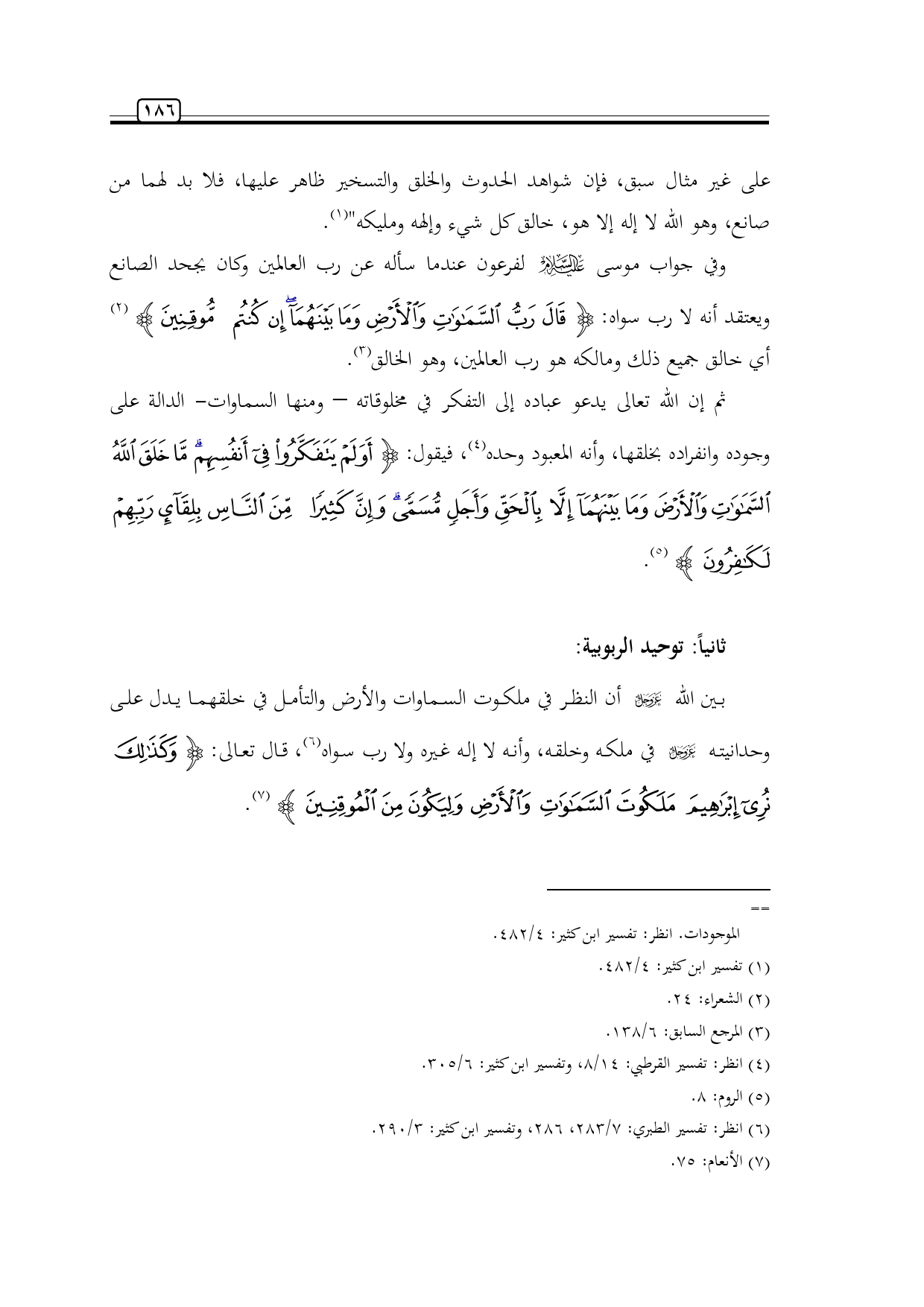 بين الله -عز وجل- أن النظر في ملكوت السماوات والأرض والتأمل في خلقهما يدل على وحدانيته -عز وجل- في ملكه وخلقه، وأنه لا إله غيره ولا رب سواه (¬6)، قال تعالى: {وَكَذَلِكَ نُرِي إِبْرَاهِيمَ مَلَكُوتَ السَّمَاوَاتِ وَالْأَرْضِ وَلِيَكُونَ مِنَ الْمُوقِنِينَ} (¬7).