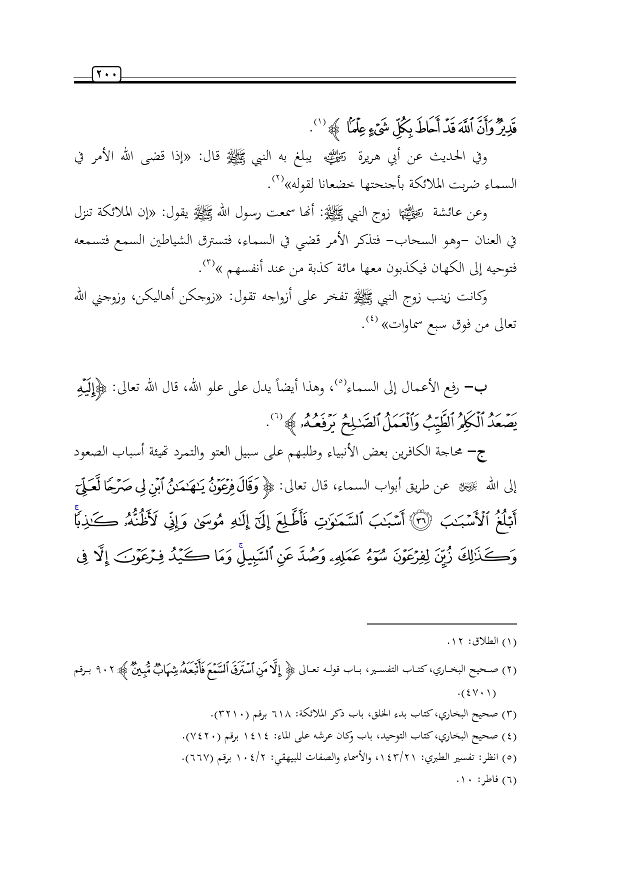 ب- رفع الأعمال إلى السماء (¬5)، وهذا أيضاً يدل على علو الله، قال الله تعالى: {إِلَيْهِ يَصْعَدُ الْكَلِمُ الطَّيِّبُ وَالْعَمَلُ الصَّالِحُ يَرْفَعُهُ} (¬6).