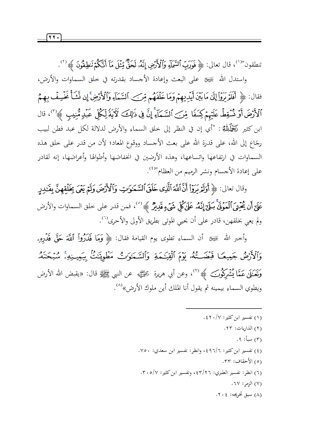 واستدل الله -عز وجل- على البعث وإعادة الأجساد بقدرته في خلق السماوات والأرض، فقال: {أَفَلَمْ يَرَوْا إِلَى مَا بَيْنَ أَيْدِيهِمْ وَمَا خَلْفَهُمْ مِنَ السَّمَاءِ وَالْأَرْضِ إِنْ نَشَأْ نَخْسِفْ بِهِمُ الْأَرْضَ أَوْ نُسْقِطْ عَلَيْهِمْ كِسَفًا مِنَ السَّمَاءِ إِنَّ فِي ذَلِكَ لَآيَةً لِكُلِّ عَبْدٍ مُنِيبٍ} (¬3)، قال ابن كثير -رحمه الله-: " أي إن في النظر إلى خلق السماء والأرض لدلالة لكل عبد فطن لبيب رجّاع إلى الله، على قدرة الله على بعث الأجساد ووقوع المعاد؛ لأن من قدر على خلق هذه السماوات في ارتفاعها واتساعها، وهذه الأرضين في انخفاضها وأطوالها وأعراضها، إنه لقادر على إعادة الأجسام ونشر الرميم من العظام" (¬4).