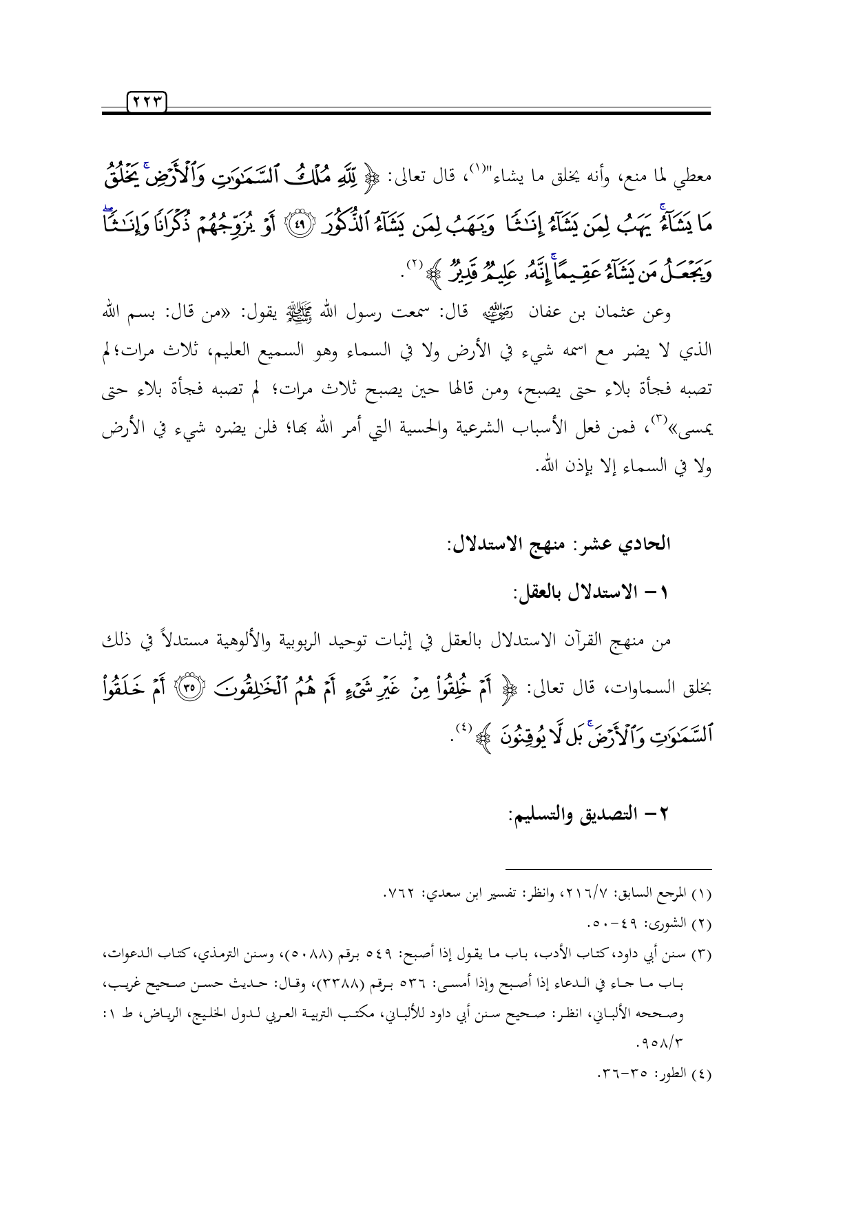 معطي لما منع، وأنه يخلق ما يشاء" (¬1)، قال تعالى: {لِلَّهِ مُلْكُ السَّمَاوَاتِ وَالْأَرْضِ يَخْلُقُ مَا يَشَاءُ يَهَبُ لِمَنْ يَشَاءُ إِنَاثًا وَيَهَبُ لِمَنْ يَشَاءُ الذُّكُورَ (49) أَوْ يُزَوِّجُهُمْ ذُكْرَانًا وَإِنَاثًا وَيَجْعَلُ مَنْ يَشَاءُ عَقِيمًا إِنَّهُ عَلِيمٌ قَدِيرٌ} (¬2).