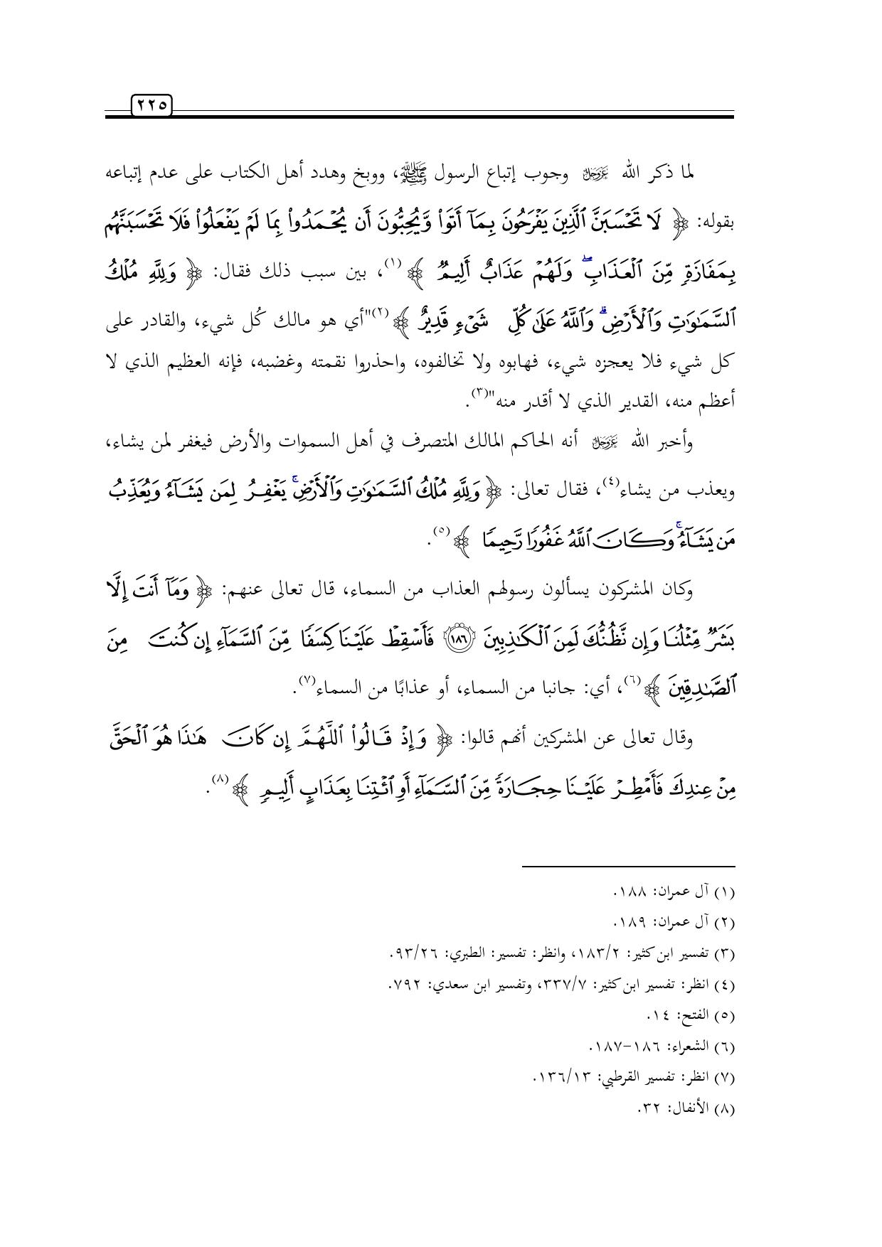 لما ذكر الله -عز وجل- وجوب إتباع الرسول -صلى الله عليه وسلم-، ووبخ وهدد أهل الكتاب على عدم إتباعه بقوله: {لَا تَحْسَبَنَّ الَّذِينَ يَفْرَحُونَ بِمَا أَتَوْا وَيُحِبُّونَ أَنْ يُحْمَدُوا بِمَا لَمْ يَفْعَلُوا فَلَا تَحْسَبَنَّهُمْ بِمَفَازَةٍ مِنَ الْعَذَابِ وَلَهُمْ عَذَابٌ أَلِيمٌ} (¬1)، بين سبب ذلك فقال: {وَلِلَّهِ مُلْكُ السَّمَاوَاتِ وَالْأَرْضِ وَاللَّهُ عَلَى كُلِّ شَيْءٍ قَدِيرٌ} (¬2) "أي هو مالك كُل شيء، والقادر على كل شيء فلا يعجزه شيء، فهابوه ولا تخالفوه، واحذروا نقمته وغضبه، فإنه العظيم الذي لا أعظم منه، القدير الذي لا أقدر منه" (¬3).
