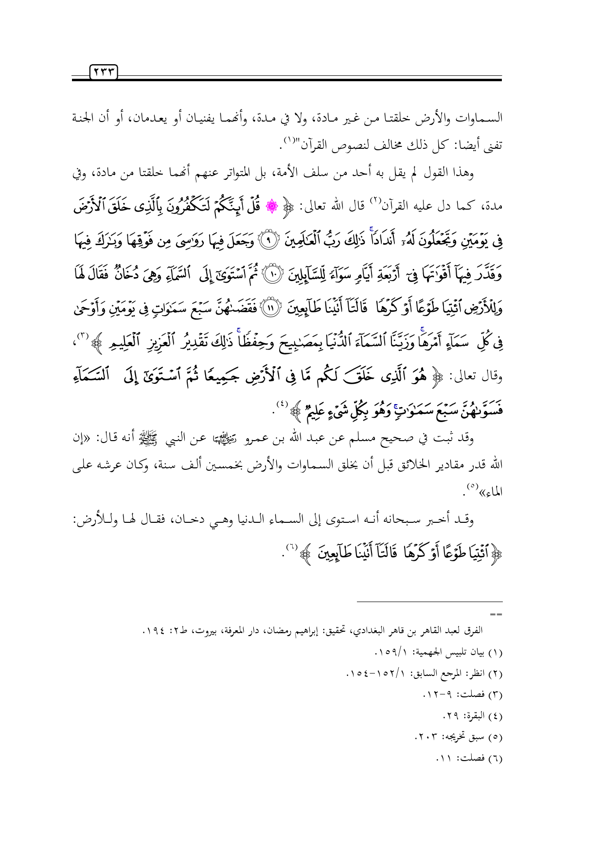 السماوات والأرض خلقتا من غير مادة، ولا في مدة، وأنهما يفنيان أو يعدمان، أو أن الجنة تفنى أيضا: كل ذلك مخالف لنصوص القرآن" (¬1).
