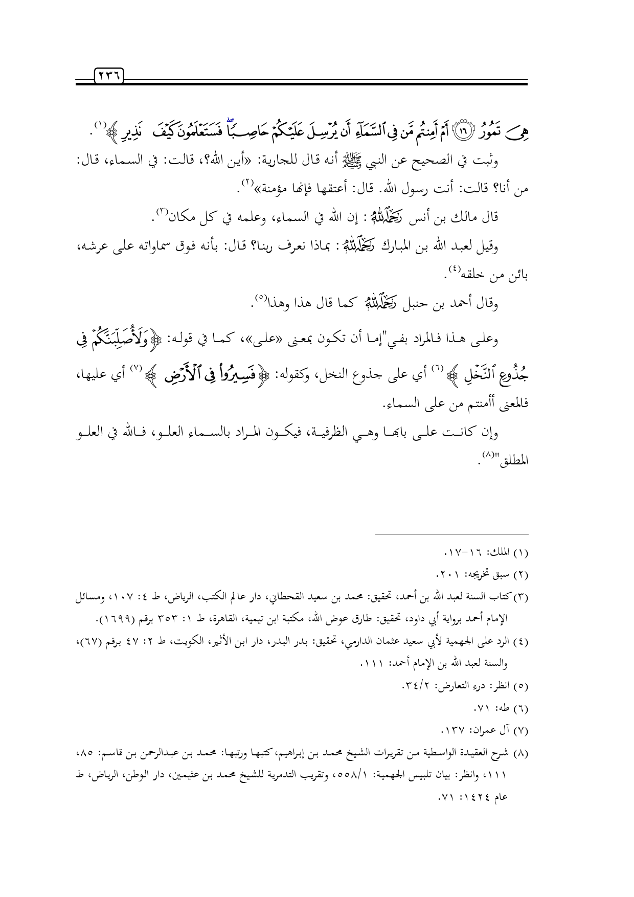 (¬8) شرح العقيدة الواسطية من تقريرات الشيخ محمد بن إبراهيم، كتبها ورتبها: محمد بن عبدالرحمن بن قاسم: 85، 111، وانظر: بيان تلبيس الجهمية: 1/ 558، وتقريب التدمرية للشيخ محمد بن عثيمين، دار الوطن، الرياض، ط عام 1424: 71.