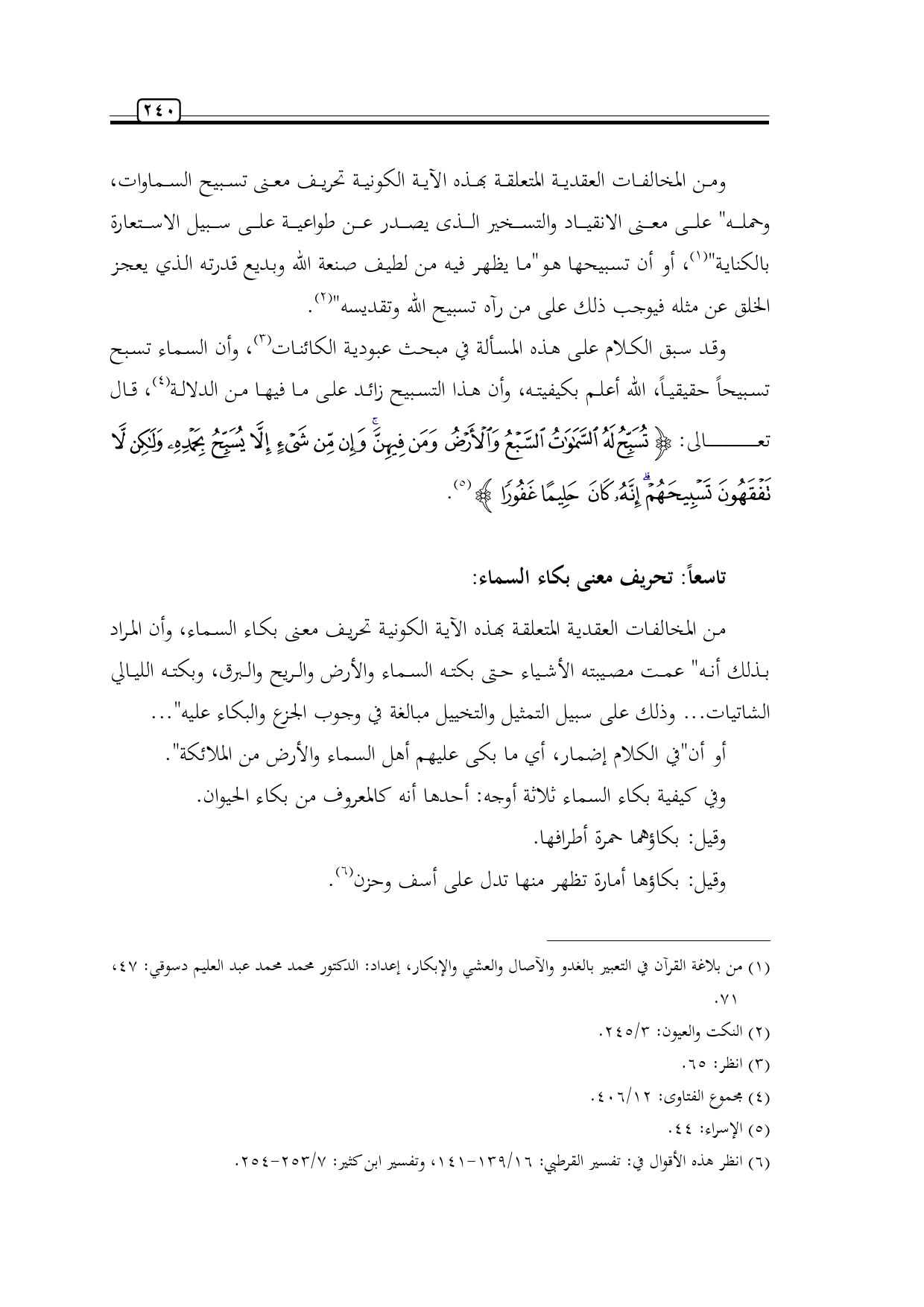 وقد سبق الكلام على هذه المسألة في مبحث عبودية الكائنات (¬3)، وأن السماء تسبح تسبيحاً حقيقياً، الله أعلم بكيفيته، وأن هذا التسبيح زائد على ما فيها من الدلالة (¬4)، قال تعالى: {تُسَبِّحُ لَهُ السَّمَاوَاتُ السَّبْعُ وَالْأَرْضُ وَمَنْ فِيهِنَّ وَإِنْ مِنْ شَيْءٍ إِلَّا يُسَبِّحُ بِحَمْدِهِ وَلَكِنْ لَا تَفْقَهُونَ تَسْبِيحَهُمْ إِنَّهُ كَانَ حَلِيمًا غَفُورًا} (¬5).