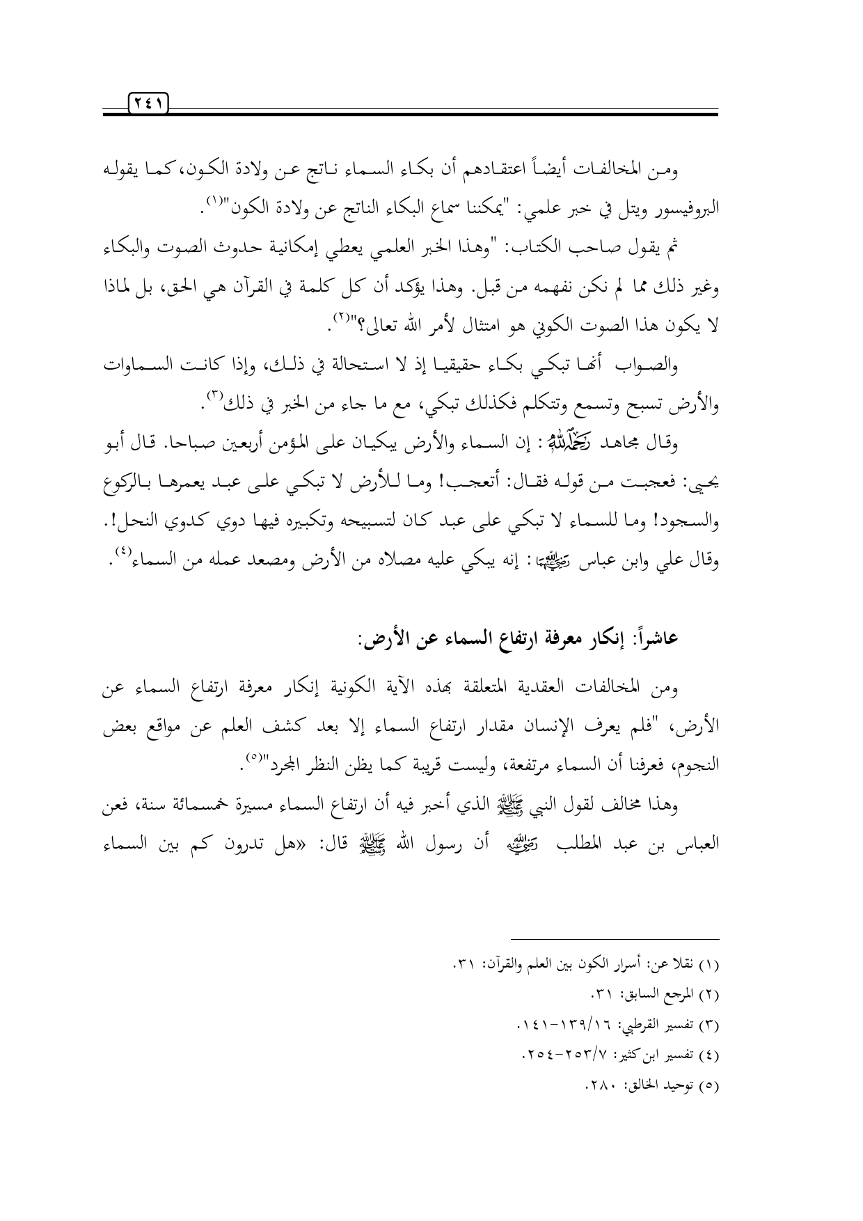 ثم يقول صاحب الكتاب: "وهذا الخبر العلمي يعطي إمكانية حدوث الصوت والبكاء وغير ذلك مما لم نكن نفهمه من قبل. وهذا يؤكد أن كل كلمة في القرآن هي الحق، بل لماذا لا يكون هذا الصوت الكوني هو امتثال لأمر الله تعالى؟ " (¬2).