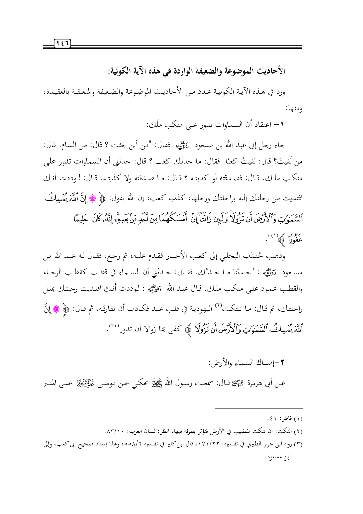 وذهب جُندَب البجلي إلى كعب الأحبار فقدم عليه، ثم رجع، فقال له عبد الله بن مسعود -رضي الله عنه-: " حدثنا ما حدثك. فقال: حدثني أن السماء في قطب كقطب الرحا، والقطب عمود على منكب ملك. قال عبد الله -رضي الله عنه-: لوددت أنك افتديت رحلتك بمثل راحلتك، ثم قال: ما تنتكت (¬2) اليهودية في قلب عبد فكادت أن تفارقه، ثم قال: {إِنَّ اللَّهَ يُمْسِكُ السَّمَاوَاتِ وَالْأَرْضَ أَنْ تَزُولَا كفى بها زوالا أن تدور"} (¬3).