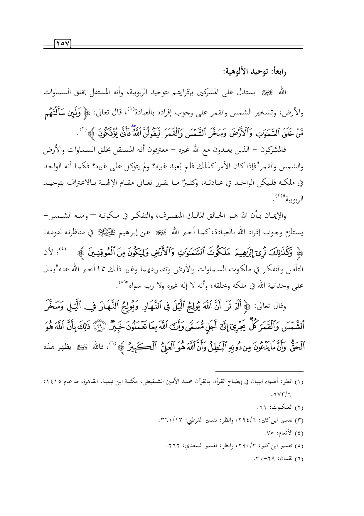 فالمشركون - الذين يعبدون مع الله غيره - معترفون أنه المستقل بخلق السماوات والأرض والشمس والقمر"فإذا كان الأمر كذلك فلم يُعبد غيره؟ ولم يتوكل على غيره؟ فكما أنه الواحد في ملكه فليكن الواحد في عبادته، وكثيرًا ما يقرر تعالى مقام الإلهية بالاعتراف بتوحيد الربوبية" (¬3).