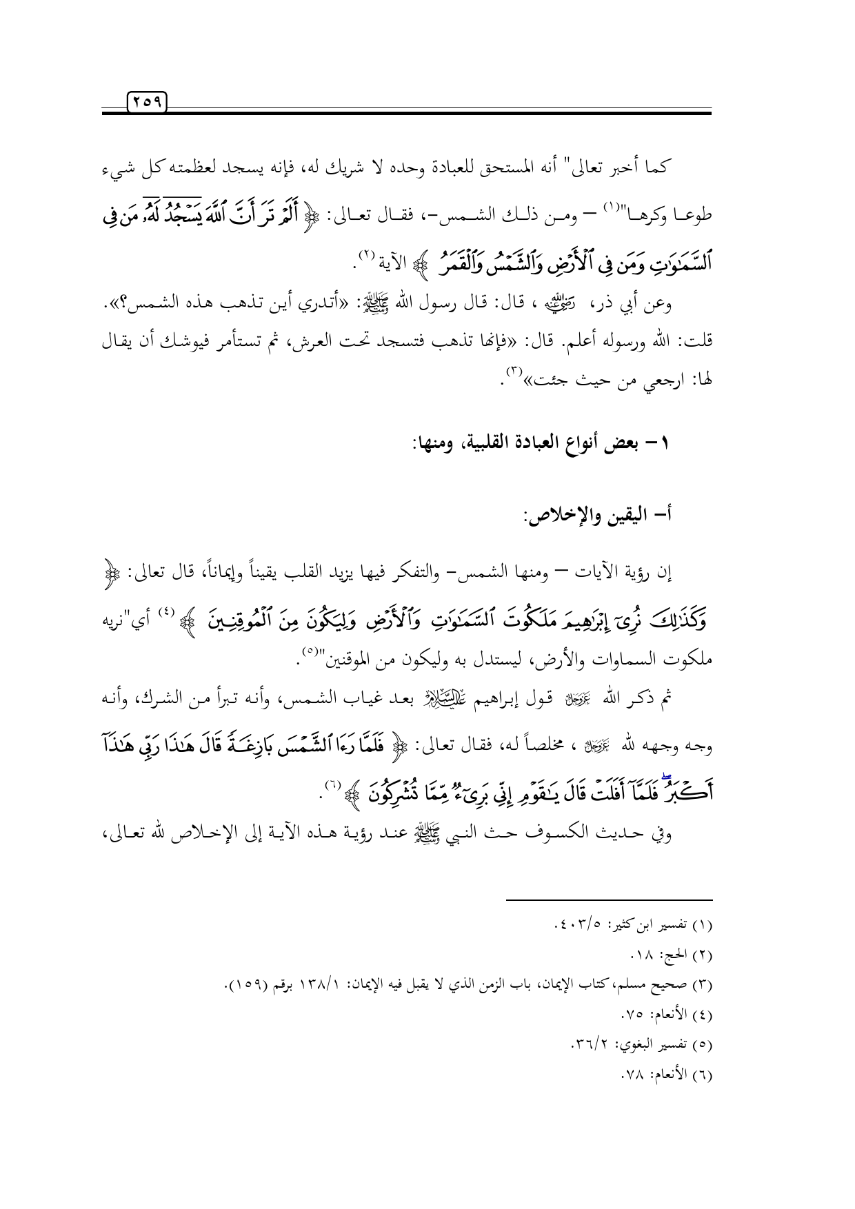 كما أخبر تعالى" أنه المستحق للعبادة وحده لا شريك له، فإنه يسجد لعظمته كل شيء طوعا وكرها" (¬1) - ومن ذلك الشمس-، فقال تعالى: {أَلَمْ تَرَ أَنَّ اللَّهَ يَسْجُدُ لَهُ مَنْ فِي السَّمَاوَاتِ وَمَنْ فِي الْأَرْضِ وَالشَّمْسُ وَالْقَمَرُ الآية} (¬2).