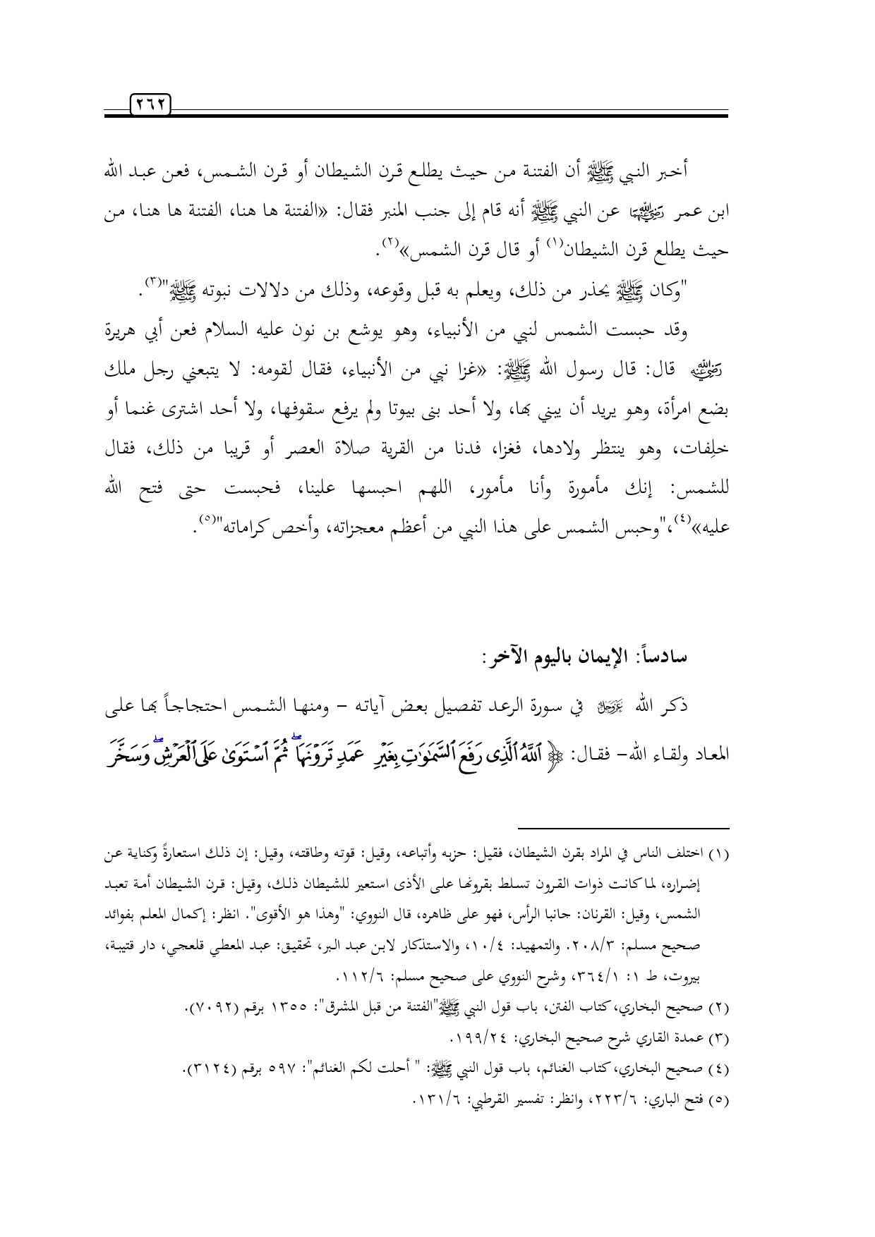(¬1) اختلف الناس في المراد بقرن الشيطان، فقيل: حزبه وأتباعه، وقيل: قوته وطاقته، وقيل: إن ذلك استعارةً وكناية عن إضراره، لما كانت ذوات القرون تسلط بقرونها على الأذى استعير للشيطان ذلك، وقيل: قرن الشيطان أمة تعبد الشمس، وقيل: القرنان: جانبا الرأس، فهو على ظاهره، قال النووي: "وهذا هو الأقوى". انظر: إكمال المعلم بفوائد صحيح مسلم: 3/ 208. والتمهيد: 4/ 10، والاستذكار لابن عبد البر، تحقيق: عبد المعطي قلعجي، دار قتيبة، بيروت، ط 1: 1/ 364، وشرح النووي على صحيح مسلم: 6/ 112.