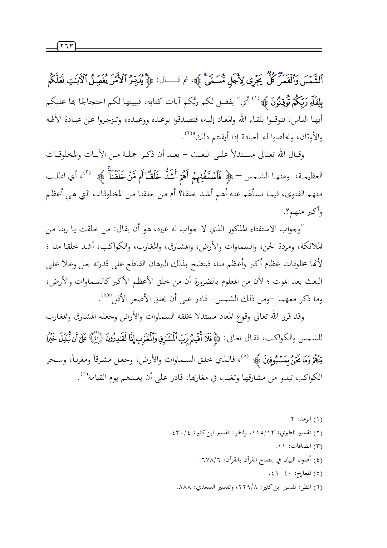 الشَّمْسَ وَالْقَمَرَ كُلٌّ يَجْرِي لِأَجَلٍ مُسَمًّى، ثم قال: {يُدَبِّرُ الْأَمْرَ يُفَصِّلُ الْآيَاتِ لَعَلَّكُمْ بِلِقَاءِ رَبِّكُمْ تُوقِنُونَ} (¬1) أي" يفصل لكم ربُّكم آيات كتابه، فيبينها لكم احتجاجًا بها عليكم أيها الناس، لتوقنوا بلقاء الله والمعاد إليه، فتصدقوا بوعده ووعيده، وتنزجروا عن عبادة الآلهة والأوثان، وتخلصوا له العبادة إذا أيقنتم ذلك" (¬2).