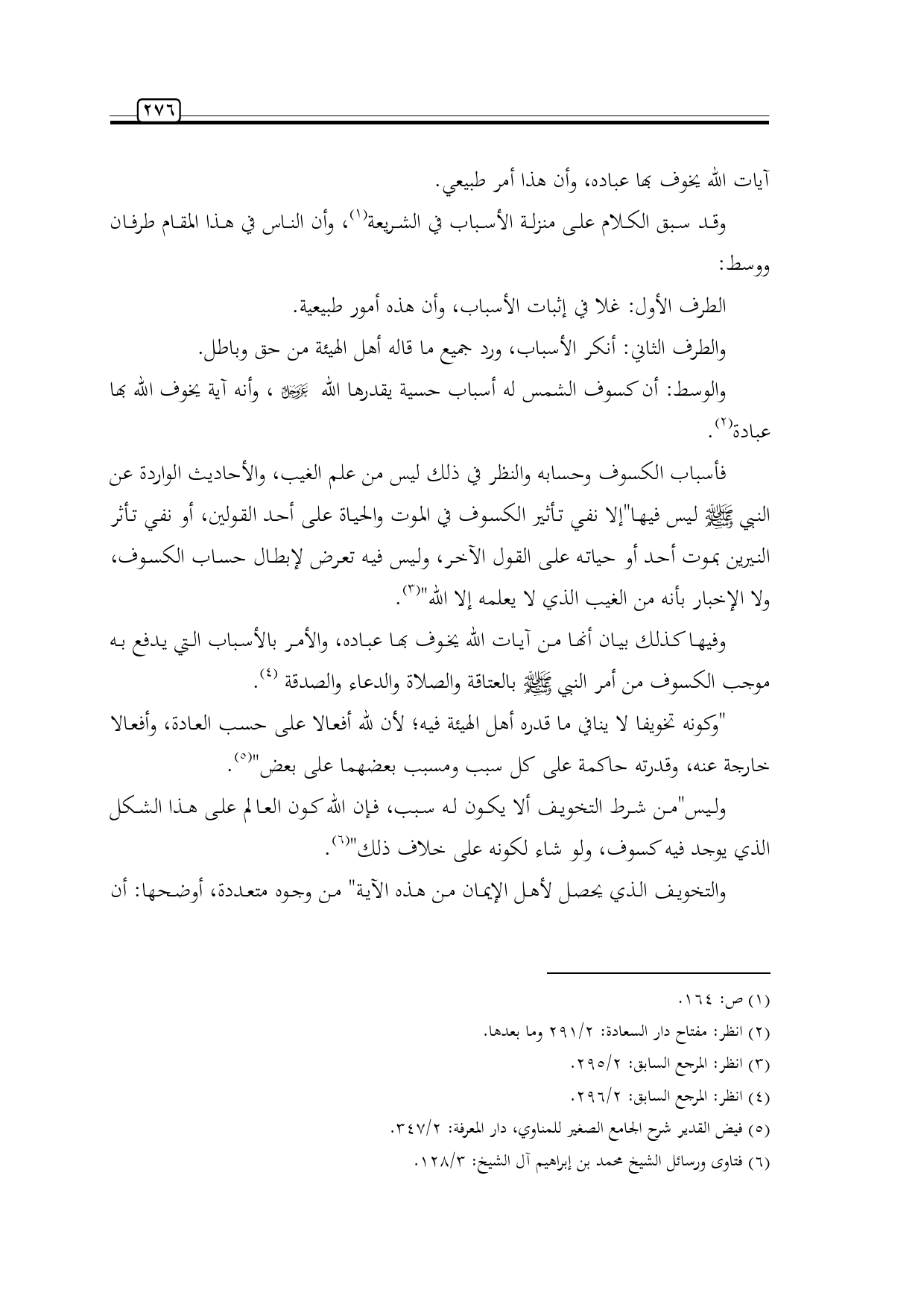 وليس"من شرط التخويف ألا يكون له سبب، فإن الله كون العالم على هذا الشكل الذي يوجد فيه كسوف، ولو شاء لكونه على خلاف ذلك" (¬6).