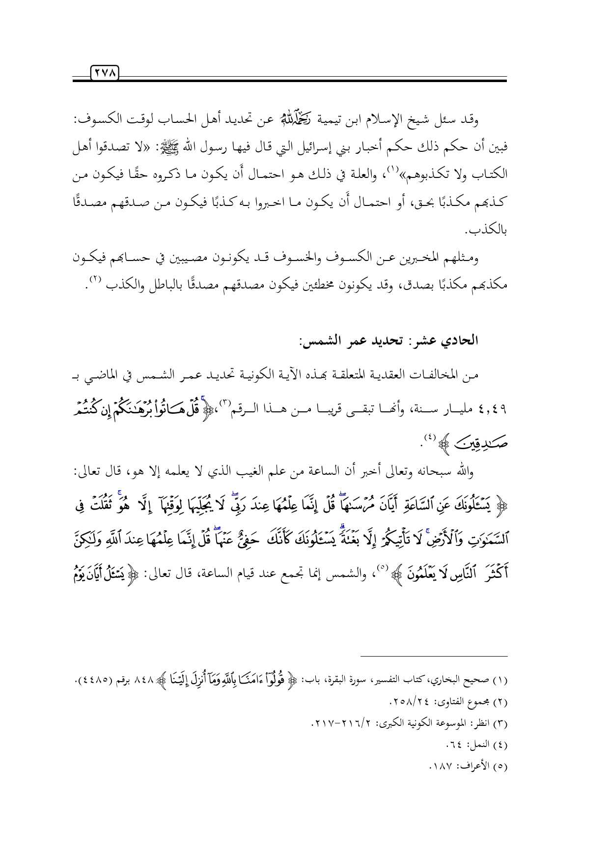والله سبحانه وتعالى أخبر أن الساعة من علم الغيب الذي لا يعلمه إلا هو، قال تعالى: {يَسْأَلُونَكَ عَنِ السَّاعَةِ أَيَّانَ مُرْسَاهَا قُلْ إِنَّمَا عِلْمُهَا عِنْدَ رَبِّي لَا يُجَلِّيهَا لِوَقْتِهَا إِلَّا هُوَ ثَقُلَتْ فِي السَّمَاوَاتِ وَالْأَرْضِ لَا تَأْتِيكُمْ إِلَّا بَغْتَةً يَسْأَلُونَكَ كَأَنَّكَ حَفِيٌّ عَنْهَا قُلْ إِنَّمَا عِلْمُهَا عِنْدَ اللَّهِ وَلَكِنَّ أَكْثَرَ النَّاسِ لَا يَعْلَمُونَ} (¬5)، والشمس إنما تجمع عند قيام الساعة، قال تعالى: {يَسْأَلُ أَيَّانَ يَوْمُ