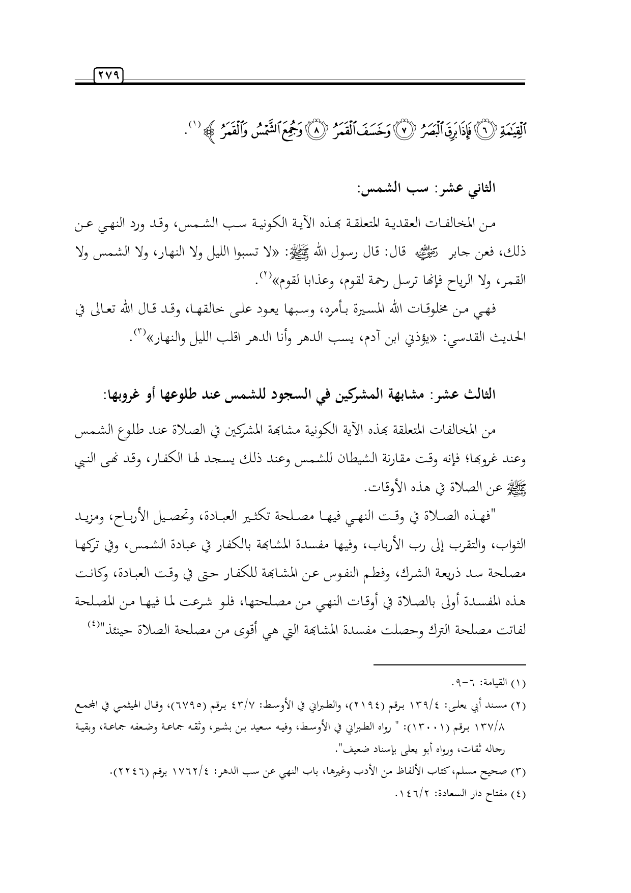 الثالث عشر: مشابهة المشركين في السجود للشمس عند طلوعها أو غروبها: