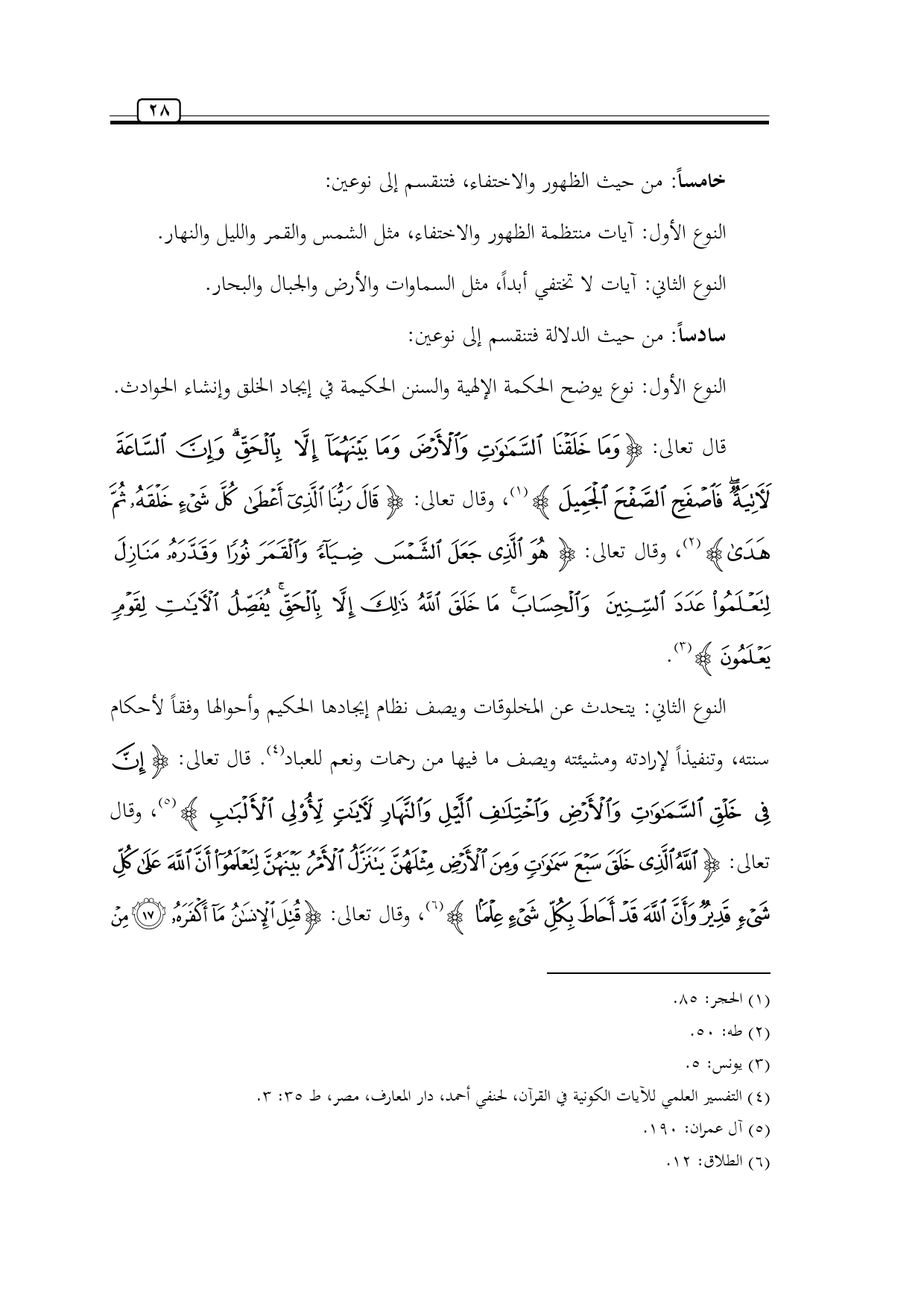 قال تعالى: {وَمَا خَلَقْنَا السَّمَاوَاتِ وَالْأَرْضَ وَمَا بَيْنَهُمَا إِلَّا بِالْحَقِّ وَإِنَّ السَّاعَةَ لَآتِيَةٌ فَاصْفَحِ الصَّفْحَ الْجَمِيلَ} (¬1)، وقال تعالى: {قَالَ رَبُّنَا الَّذِي أَعْطَى كُلَّ شَيْءٍ خَلْقَهُ ثُمَّ هَدَى} (¬2)، وقال تعالى: {هُوَ الَّذِي جَعَلَ الشَّمْسَ ضِيَاءً وَالْقَمَرَ نُورًا وَقَدَّرَهُ مَنَازِلَ لِتَعْلَمُوا عَدَدَ السِّنِينَ وَالْحِسَابَ مَا خَلَقَ اللَّهُ ذَلِكَ إِلَّا بِالْحَقِّ يُفَصِّلُ الْآيَاتِ لِقَوْمٍ يَعْلَمُونَ} (¬3).