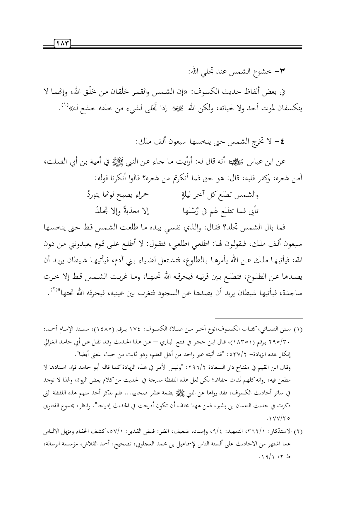 (¬1) سنن النسائي، كتاب الكسوف، نوع آخر من صلاة الكسوف: 174 برقم (1485)، مسند الإمام أحمد: 30/ 295 برقم (18351)، قال ابن حجر في فتح الباري - عن هذا الحديث وقد نقل عن أبي حامد الغزالي إنكار هذه الزيادة- 2/ 537: "قد أثبته غير واحد من أهل العلم، وهو ثابت من حيث المعنى أيضا".