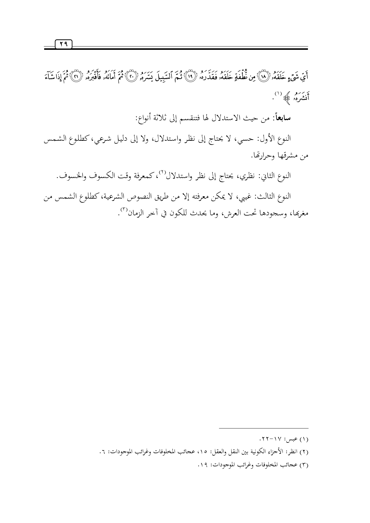 النوع الأول: حسي، لا يحتاج إلى نظر واستدلال، ولا إلى دليل شرعي، كطلوع الشمس من مشرقها وحرارتها.