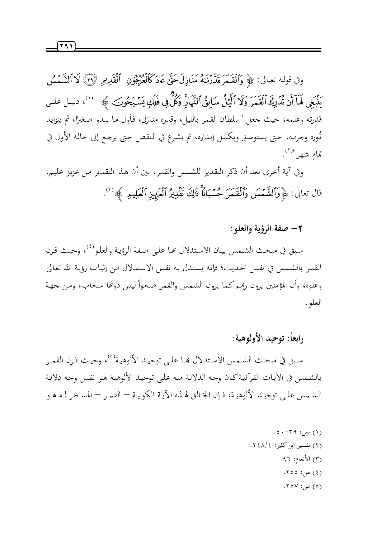 وفي قوله تعالى: {وَالْقَمَرَ قَدَّرْنَاهُ مَنَازِلَ حَتَّى عَادَ كَالْعُرْجُونِ الْقَدِيمِ (39) لَا الشَّمْسُ يَنْبَغِي لَهَا أَنْ تُدْرِكَ الْقَمَرَ وَلَا اللَّيْلُ سَابِقُ النَّهَارِ وَكُلٌّ فِي فَلَكٍ يَسْبَحُونَ} (¬1)، دليل على قدرته وعلمه، حيث جعل "سلطان القمر بالليل، وقدره منازل، فأول ما يبدو صغيرًا، ثم يتزايد نُوره وجرمه، حتى يستوسق ويكمل إبداره، ثم يشرع في النقص حتى يرجع إلى حاله الأول في تمام شهر" (¬2).