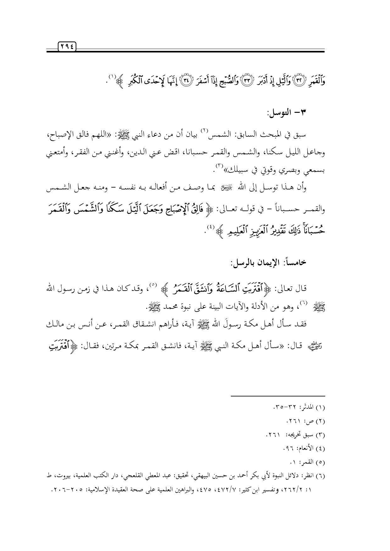 وأن هذا توسل إلى الله -عز وجل- بما وصف من أفعاله به نفسه - ومنه جعل الشمس والقمر حسباناً - في قوله تعالى: {فَالِقُ الْإِصْبَاحِ وَجَعَلَ اللَّيْلَ سَكَنًا وَالشَّمْسَ وَالْقَمَرَ حُسْبَانًا ذَلِكَ تَقْدِيرُ الْعَزِيزِ الْعَلِيمِ} (¬4).