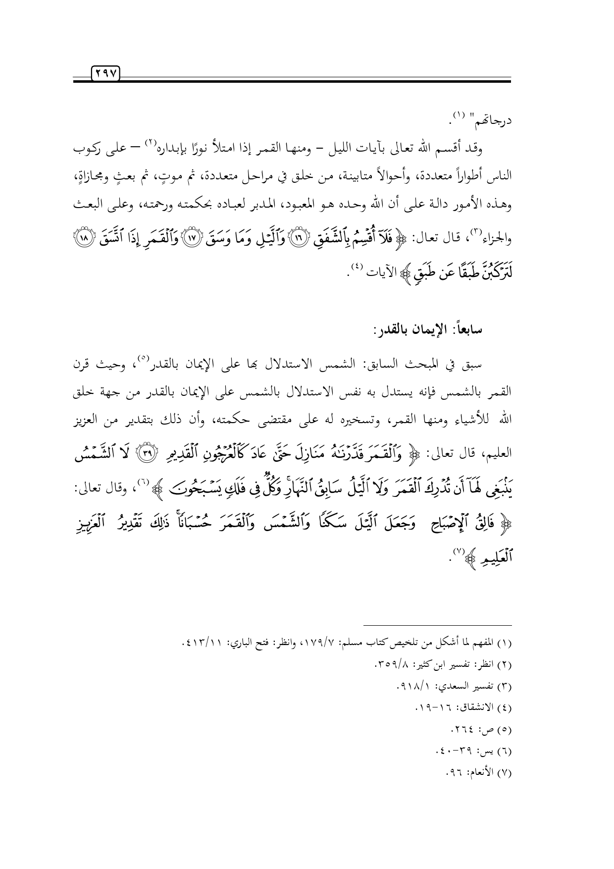وقد أقسم الله تعالى بآيات الليل - ومنها القمر إذا امتلأ نورًا بإبداره (¬2) - على ركوب الناس أطواراً متعددة، وأحوالاً متابينة، من خلق في مراحل متعددة، ثم موتٍ، ثم بعثٍ ومجازاةٍ، وهذه الأمور دالة على أن الله وحده هو المعبود، المدبر لعباده بحكمته ورحمته، وعلى البعث والجزاء (¬3)، قال تعال: {فَلَا أُقْسِمُ بِالشَّفَقِ (16) وَاللَّيْلِ وَمَا وَسَقَ (17) وَالْقَمَرِ إِذَا اتَّسَقَ (18) لَتَرْكَبُنَّ طَبَقًا عَنْ طَبَقٍ الآيات} (¬4).
