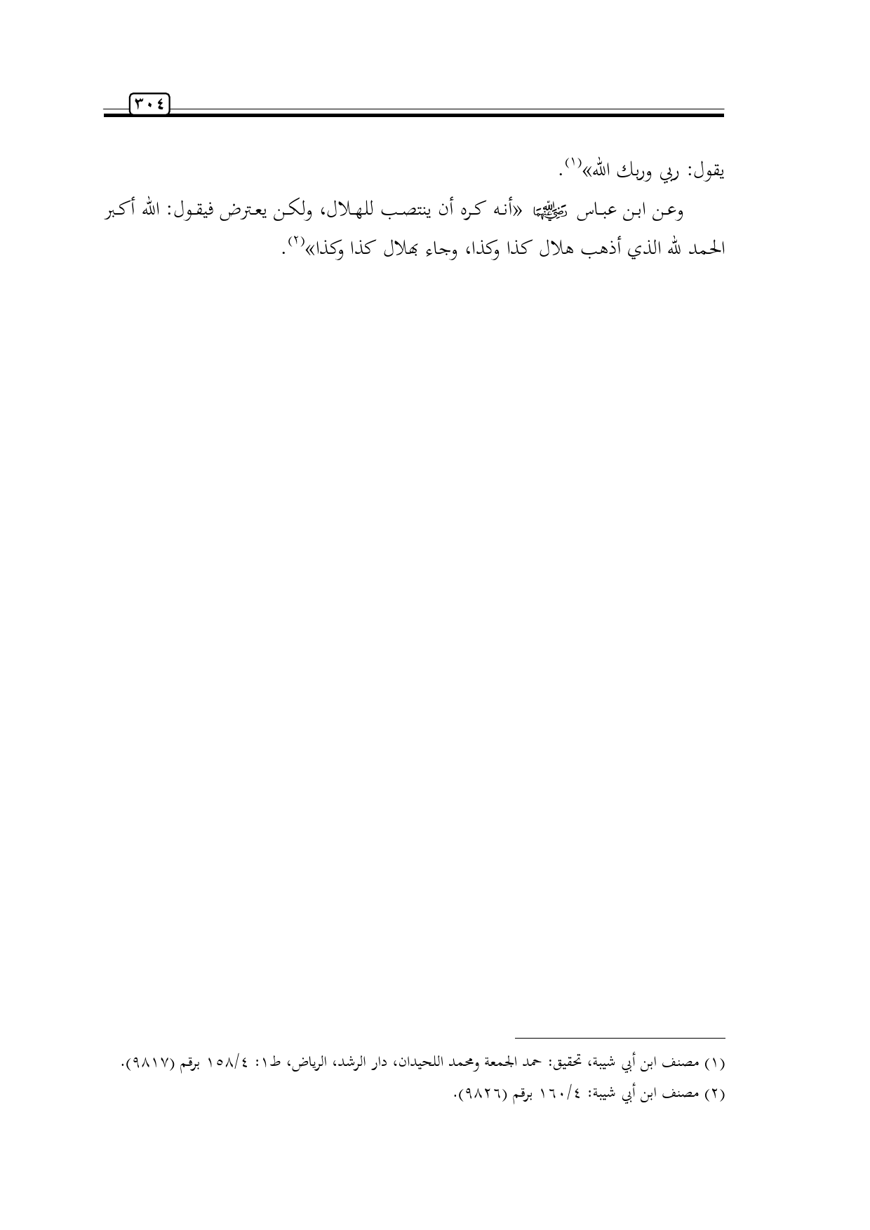 وعن ابن عباس -رضي الله عنهما- «أنه كره أن ينتصب للهلال، ولكن يعترض فيقول: الله أكبر الحمد لله الذي أذهب هلال كذا وكذا، وجاء بهلال كذا وكذا» (¬2).