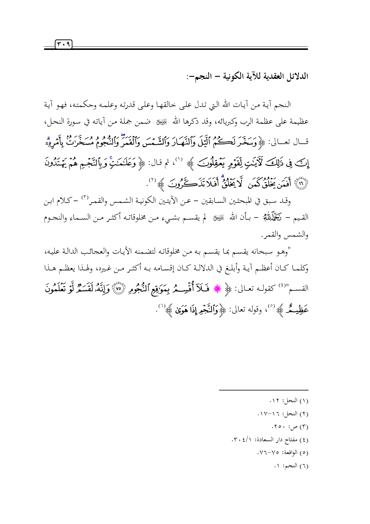 النجم آية من آيات الله التي تدل على خالقها وعلى قدرته وعلمه وحكمته، فهو آية عظيمة على عظمة الرب وكبريائه، وقد ذكرها الله -عز وجل- ضمن جملة من آياته في سورة النحل، قال تعالى: {وَسَخَّرَ لَكُمُ اللَّيْلَ وَالنَّهَارَ وَالشَّمْسَ وَالْقَمَرَ وَالنُّجُومُ مُسَخَّرَاتٌ بِأَمْرِهِ إِنَّ فِي ذَلِكَ لَآيَاتٍ لِقَوْمٍ يَعْقِلُونَ} (¬1)، ثم قال: {وَعَلَامَاتٍ وَبِالنَّجْمِ هُمْ يَهْتَدُونَ (16) أَفَمَنْ يَخْلُقُ كَمَنْ لَا يَخْلُقُ أَفَلَا تَذَكَّرُونَ} (¬2).