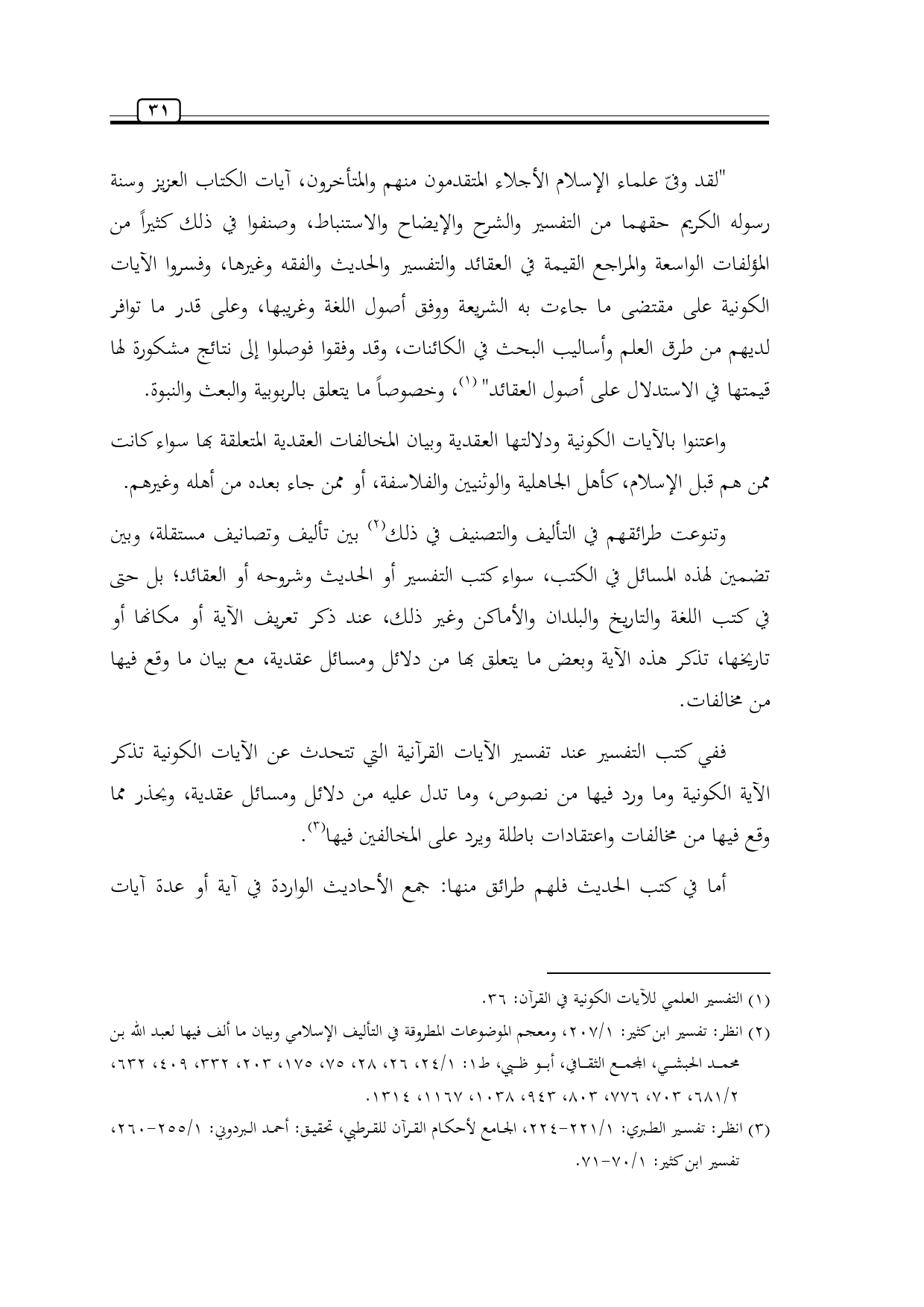 "لقد وفىّ علماء الإسلام الأجلاء المتقدمون منهم والمتأخرون، آيات الكتاب العزيز وسنة رسوله الكريم حقهما من التفسير والشرح والإيضاح والاستنباط، وصنفوا في ذلك كثيراً من المؤلفات الواسعة والمراجع القيمة في العقائد والتفسير والحديث والفقه وغيرها، وفسروا الآيات الكونية على مقتضى ما جاءت به الشريعة ووفق أصول اللغة وغريبها، وعلى قدر ما توافر لديهم من طرق العلم وأساليب البحث في الكائنات، وقد وفقوا فوصلوا إلى نتائج مشكورة لها قيمتها في الاستدلال على أصول العقائد" (¬1)، وخصوصاً ما يتعلق بالربوبية والبعث والنبوة.