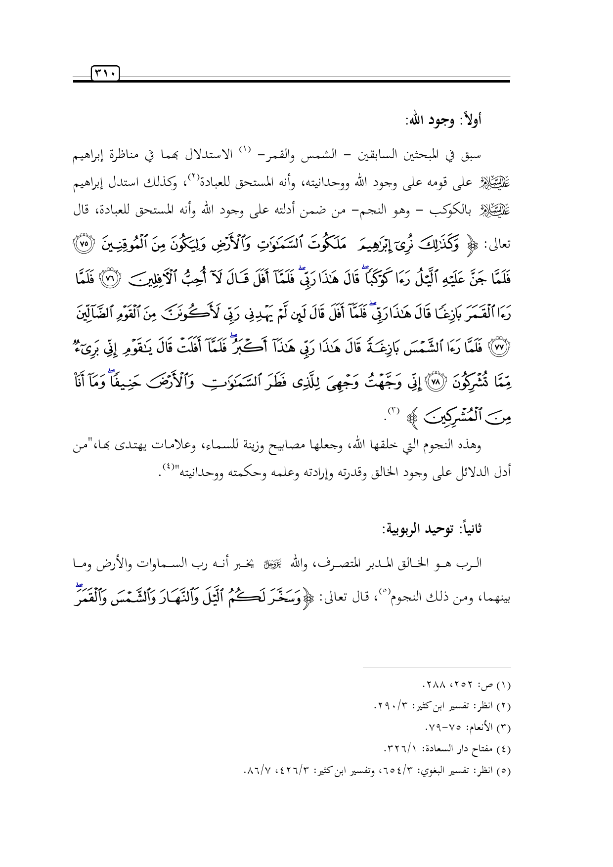سبق في المبحثين السابقين - الشمس والقمر- (¬1) الاستدلال بهما في مناظرة إبراهيم -عليه السلام- على قومه على وجود الله ووحدانيته، وأنه المستحق للعبادة (¬2)، وكذلك استدل إبراهيم -عليه السلام- بالكوكب - وهو النجم- من ضمن أدلته على وجود الله وأنه المستحق للعبادة، قال تعالى: {وَكَذَلِكَ نُرِي إِبْرَاهِيمَ مَلَكُوتَ السَّمَاوَاتِ وَالْأَرْضِ وَلِيَكُونَ مِنَ الْمُوقِنِينَ (75) فَلَمَّا جَنَّ عَلَيْهِ اللَّيْلُ رَأَى كَوْكَبًا قَالَ هَذَا رَبِّي فَلَمَّا أَفَلَ قَالَ لَا أُحِبُّ الْآفِلِينَ (76) فَلَمَّا رَأَى الْقَمَرَ بَازِغًا قَالَ هَذَا رَبِّي فَلَمَّا أَفَلَ قَالَ لَئِنْ لَمْ يَهْدِنِي رَبِّي لَأَكُونَنَّ مِنَ الْقَوْمِ الضَّالِّينَ (77) فَلَمَّا رَأَى الشَّمْسَ بَازِغَةً قَالَ هَذَا رَبِّي هَذَا أَكْبَرُ فَلَمَّا أَفَلَتْ قَالَ يَاقَوْمِ إِنِّي بَرِيءٌ مِمَّا تُشْرِكُونَ (78) إِنِّي وَجَّهْتُ وَجْهِيَ لِلَّذِي فَطَرَ السَّمَاوَاتِ وَالْأَرْضَ حَنِيفًا وَمَا أَنَا مِنَ الْمُشْرِكِينَ} (¬3).