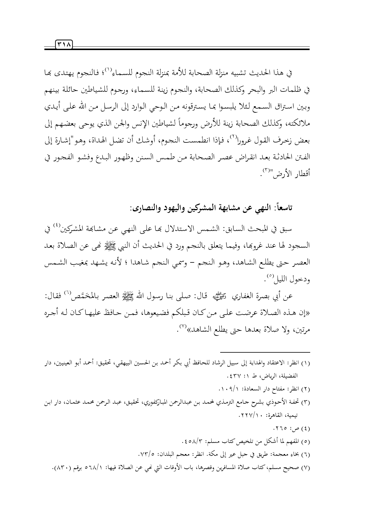 سبق في المبحث السابق: الشمس الاستدلال بها على النهي عن مشابهة المشركين (¬4) في السجود لها عند غروبها، وفيما يتعلق بالنجم ورد في الحديث أن النبي -صلى الله عليه وسلم- نهى عن الصلاة بعد العصر حتى يطلع الشاهد، وهو النجم - وسمي النجم شاهدا؛ لأنه يشهد بمغيب الشمس ودخول الليل (¬5).