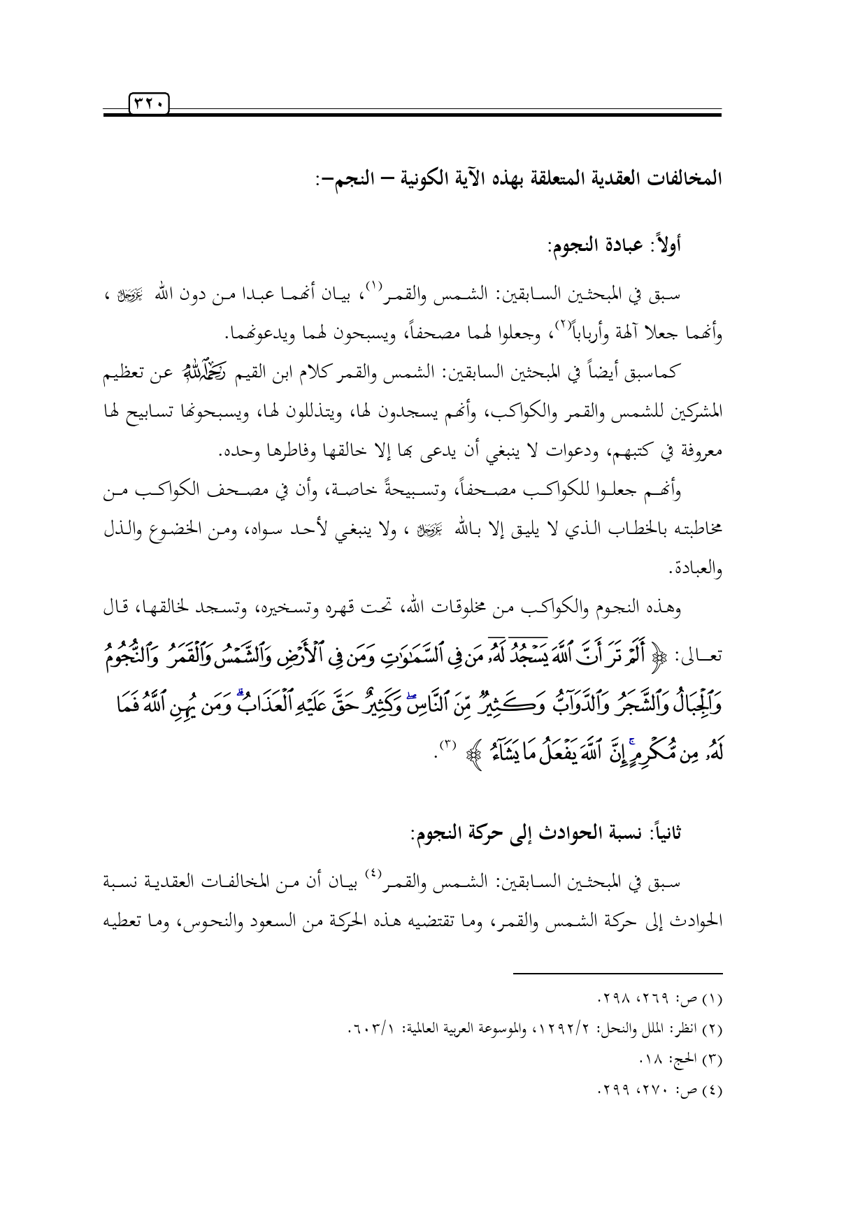 سبق في المبحثين السابقين: الشمس والقمر (¬4) بيان أن من المخالفات العقدية نسبة الحوادث إلى حركة الشمس والقمر، وما تقتضيه هذه الحركة من السعود والنحوس، وما تعطيه