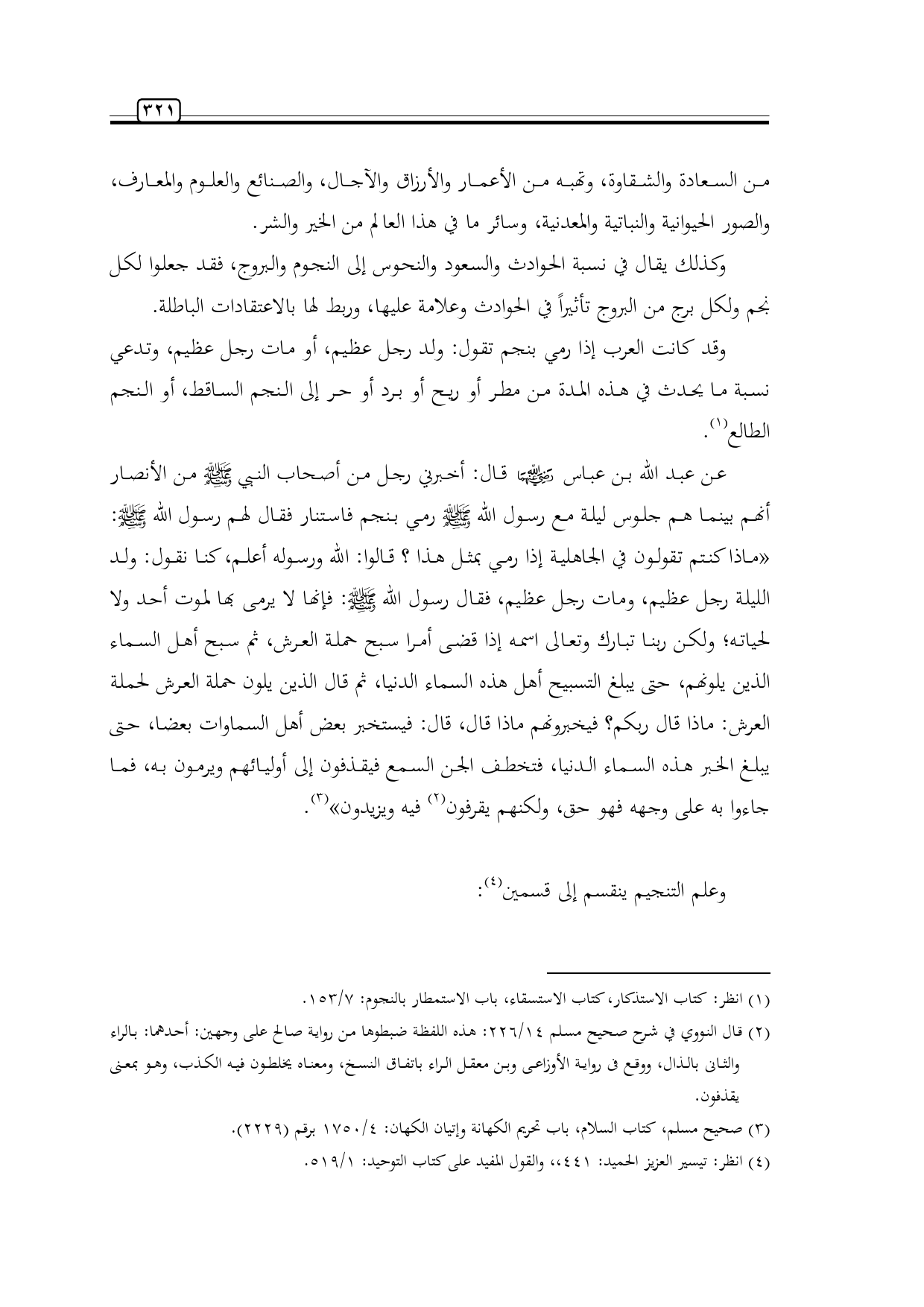 عن عبد الله بن عباس -رضي الله عنهما- قال: أخبرني رجل من أصحاب النبي -صلى الله عليه وسلم- من الأنصار أنهم بينما هم جلوس ليلة مع رسول الله -صلى الله عليه وسلم- رمي بنجم فاستنار فقال لهم رسول الله -صلى الله عليه وسلم-: «ماذا كنتم تقولون في الجاهلية إذا رمي بمثل هذا؟ قالوا: الله ورسوله أعلم، كنا نقول: ولد الليلة رجل عظيم، ومات رجل عظيم، فقال رسول الله -صلى الله عليه وسلم-: فإنها لا يرمى بها لموت أحد ولا لحياته؛ ولكن ربنا تبارك وتعالى اسمه إذا قضى أمرا سبح حملة العرش، ثم سبح أهل السماء الذين يلونهم، حتى يبلغ التسبيح أهل هذه السماء الدنيا، ثم قال الذين يلون حملة العرش لحملة العرش: ماذا قال ربكم؟ فيخبرونهم ماذا قال، قال: فيستخبر بعض أهل السماوات بعضا، حتى يبلغ الخبر هذه السماء الدنيا، فتخطف الجن السمع فيقذفون إلى أوليائهم ويرمون به، فما جاءوا به على وجهه فهو حق، ولكنهم يقرفون (¬2) فيه ويزيدون» (¬3).