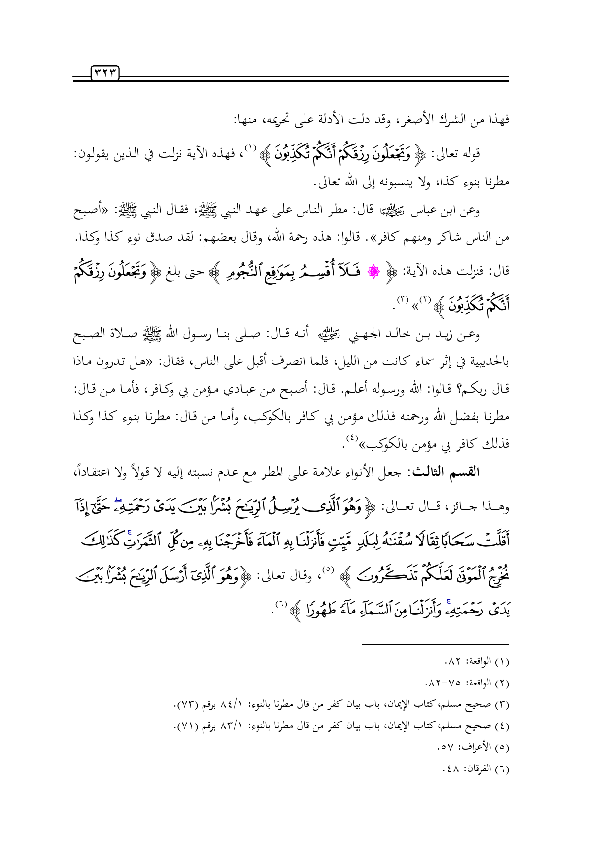 وعن زيد بن خالد الجهني -رضي الله عنه- أنه قال: صلى بنا رسول الله -صلى الله عليه وسلم- صلاة الصبح بالحديبية في إثر سماء كانت من الليل، فلما انصرف أقبل على الناس، فقال: «هل تدرون ماذا قال ربكم؟ قالوا: الله ورسوله أعلم. قال: أصبح من عبادي مؤمن بي وكافر، فأما من قال: مطرنا بفضل الله ورحمته فذلك مؤمن بي كافر بالكوكب، وأما من قال: مطرنا بنوء كذا وكذا فذلك كافر بي مؤمن بالكوكب» (¬11).