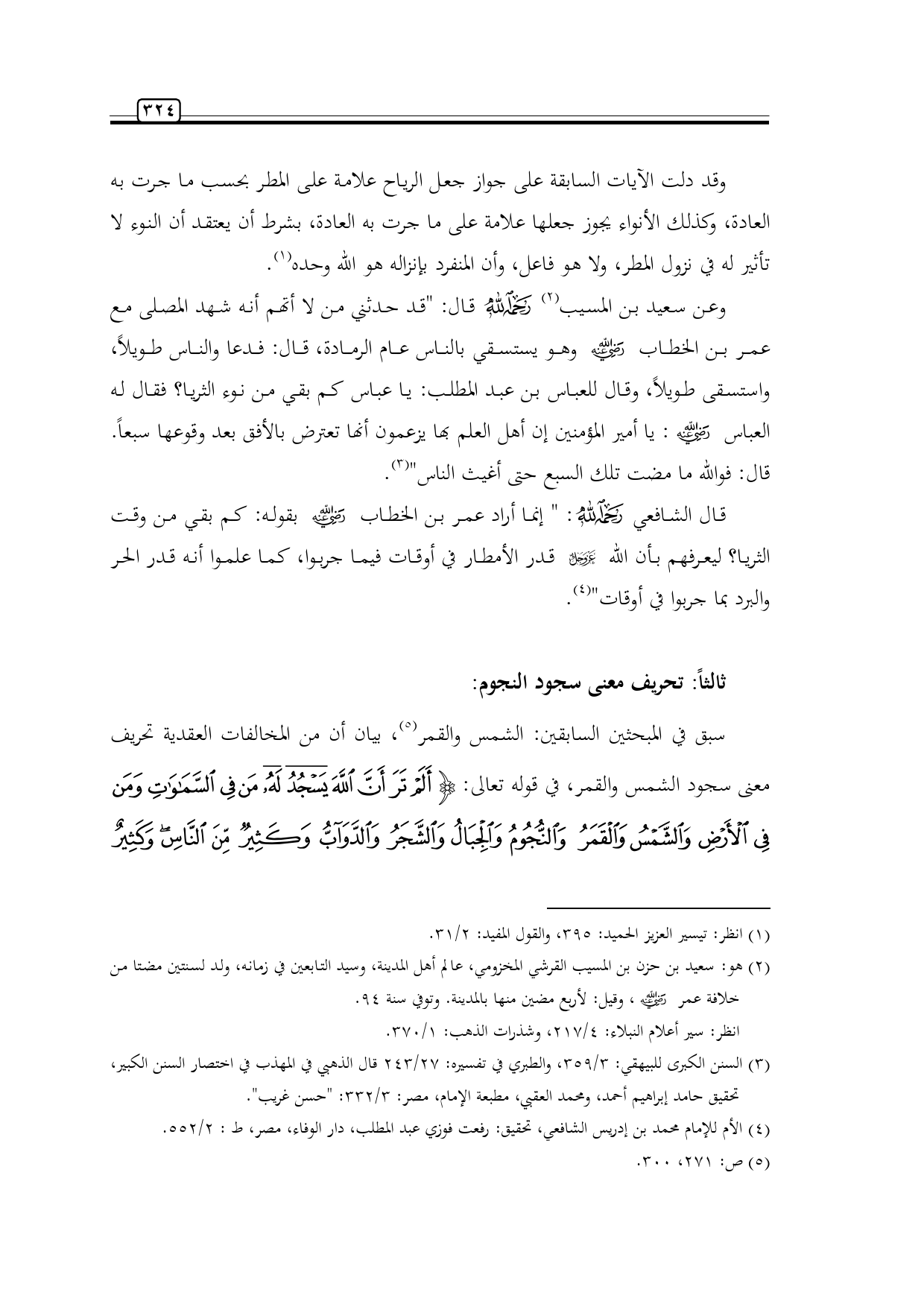 وعن سعيد بن المسيب (¬3) -رحمه الله- قال: "قد حدثني من لا أتهم أنه شهد المصلى مع عمر بن الخطاب -رضي الله عنه- وهو يستسقي بالناس عام الرمادة، قال: فدعا والناس طويلاً، واستسقى طويلاً، وقال للعباس بن عبد المطلب: يا عباس كم بقي من نوء الثريا؟ فقال له العباس -رضي الله عنه-: يا أمير المؤمنين إن أهل العلم بها يزعمون أنها تعترض بالأفق بعد وقوعها سبعاً. قال: فوالله ما مضت تلك السبع حتى أغيث الناس" (¬4).