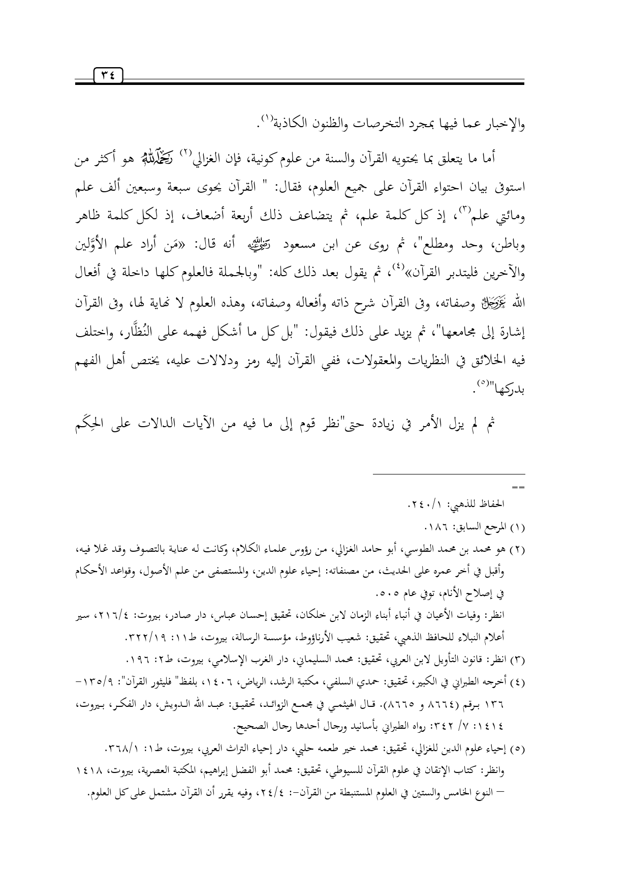 أما ما يتعلق بما يحتويه القرآن والسنة من علوم كونية، فإن الغزالي (¬2) -رحمه الله- هو أكثر من استوفى بيان احتواء القرآن على جميع العلوم، فقال: " القرآن يحوى سبعة وسبعين ألف علم ومائتي علم (¬3)، إذ كل كلمة علم، ثم يتضاعف ذلك أربعة أضعاف، إذ لكل كلمة ظاهر وباطن، وحد ومطلع"، ثم روى عن ابن مسعود -رضي الله عنه- أنه قال: «مَن أراد علم الأوَّلين والآخرين فليتدبر القرآن» (¬4)، ثم يقول بعد ذلك كله: "وبالجملة فالعلوم كلها داخلة في أفعال الله -عز وجل- وصفاته، وفى القرآن شرح ذاته وأفعاله وصفاته، وهذه العلوم لا نهاية لها، وفى القرآن إشارة إلى مجامعها"، ثم يزيد على ذلك فيقول: "بل كل ما أشكل فهمه على النُظَّار، واختلف فيه الخلائق في النظريات والمعقولات، ففي القرآن إليه رمز ودلالات عليه، يختص أهل الفهم بدركها" (¬5).