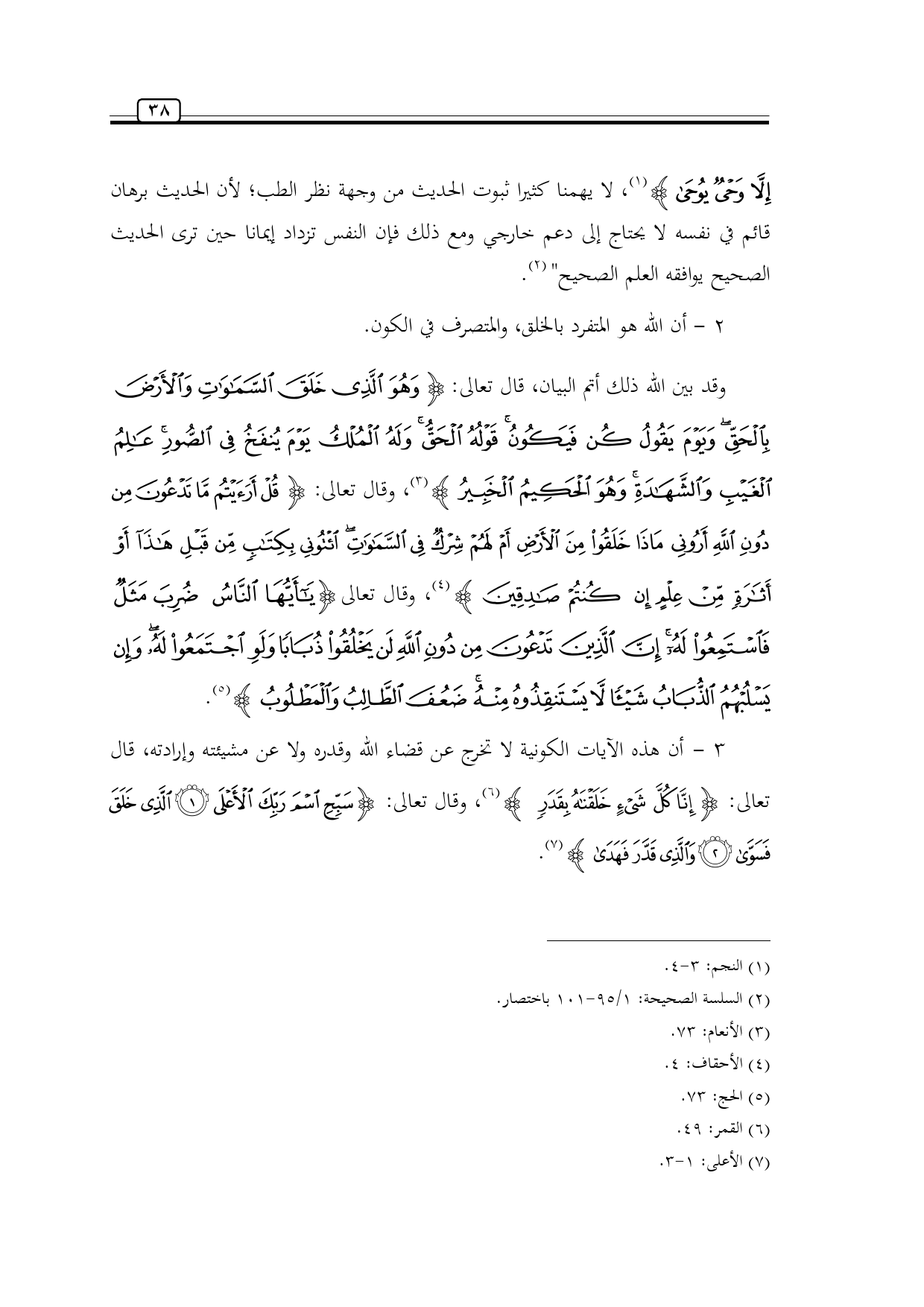 وقد بين الله ذلك أتم البيان، قال تعالى: {وَهُوَ الَّذِي خَلَقَ السَّمَاوَاتِ وَالْأَرْضَ بِالْحَقِّ وَيَوْمَ يَقُولُ كُنْ فَيَكُونُ قَوْلُهُ الْحَقُّ وَلَهُ الْمُلْكُ يَوْمَ يُنْفَخُ فِي الصُّورِ عَالِمُ الْغَيْبِ وَالشَّهَادَةِ وَهُوَ الْحَكِيمُ الْخَبِيرُ} (¬3)، وقال تعالى: {قُلْ أَرَأَيْتُمْ مَا تَدْعُونَ مِنْ دُونِ اللَّهِ أَرُونِي مَاذَا خَلَقُوا مِنَ الْأَرْضِ أَمْ لَهُمْ شِرْكٌ فِي السَّمَاوَاتِ ائْتُونِي بِكِتَابٍ مِنْ قَبْلِ هَذَا أَوْ أَثَارَةٍ مِنْ عِلْمٍ إِنْ كُنْتُمْ صَادِقِينَ} (¬4)، وقال تعالى {يَاأَيُّهَا النَّاسُ ضُرِبَ مَثَلٌ فَاسْتَمِعُوا لَهُ إِنَّ الَّذِينَ تَدْعُونَ مِنْ دُونِ اللَّهِ لَنْ يَخْلُقُوا ذُبَابًا وَلَوِ اجْتَمَعُوا لَهُ وَإِنْ يَسْلُبْهُمُ الذُّبَابُ شَيْئًا لَا يَسْتَنْقِذُوهُ مِنْهُ ضَعُفَ الطَّالِبُ وَالْمَطْلُوبُ} (¬5).