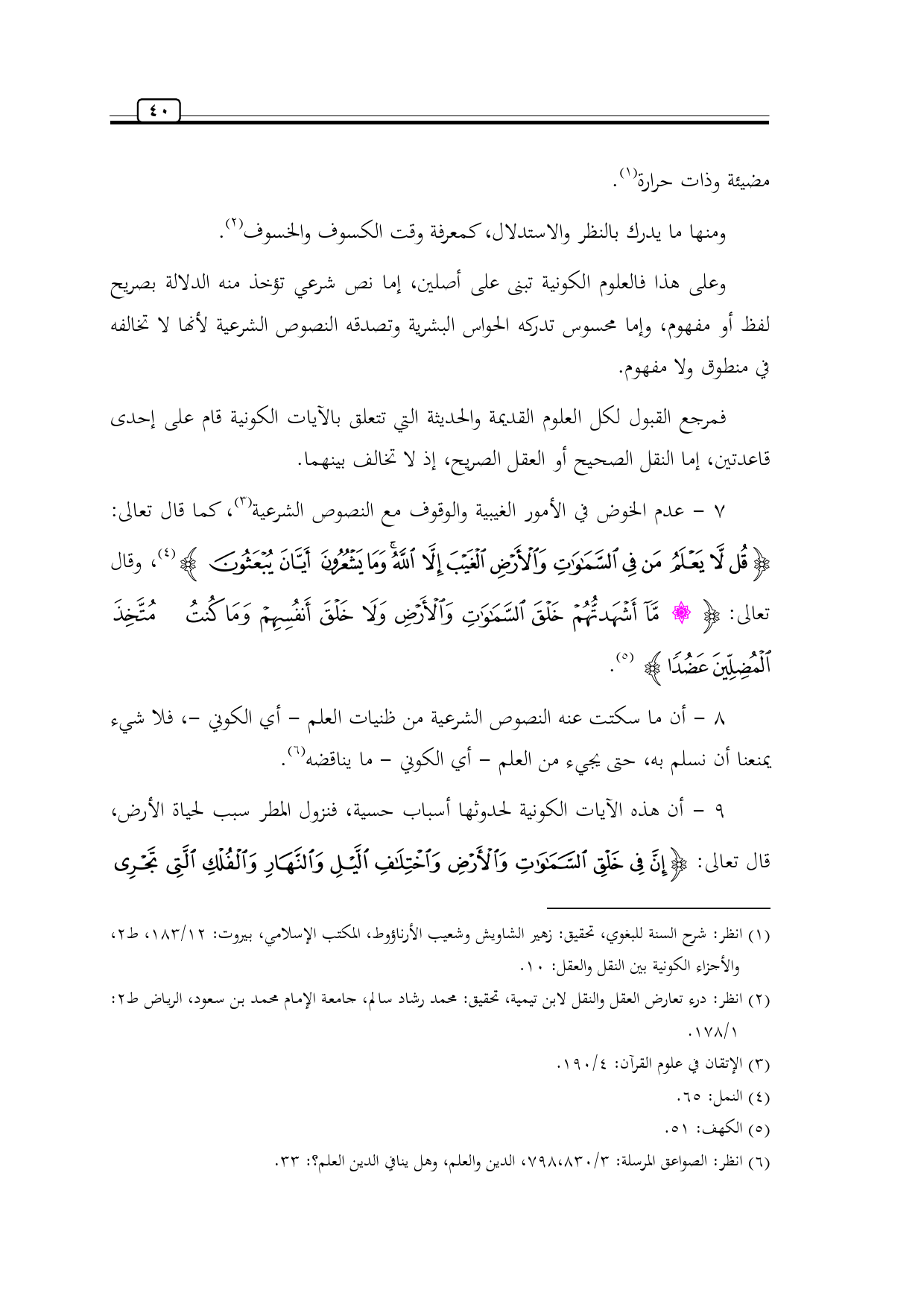 وعلى هذا فالعلوم الكونية تبنى على أصلين، إما نص شرعي تؤخذ منه الدلالة بصريح لفظ أو مفهوم، وإما محسوس تدركه الحواس البشرية وتصدقه النصوص الشرعية لأنها لا تخالفه في منطوق ولا مفهوم.