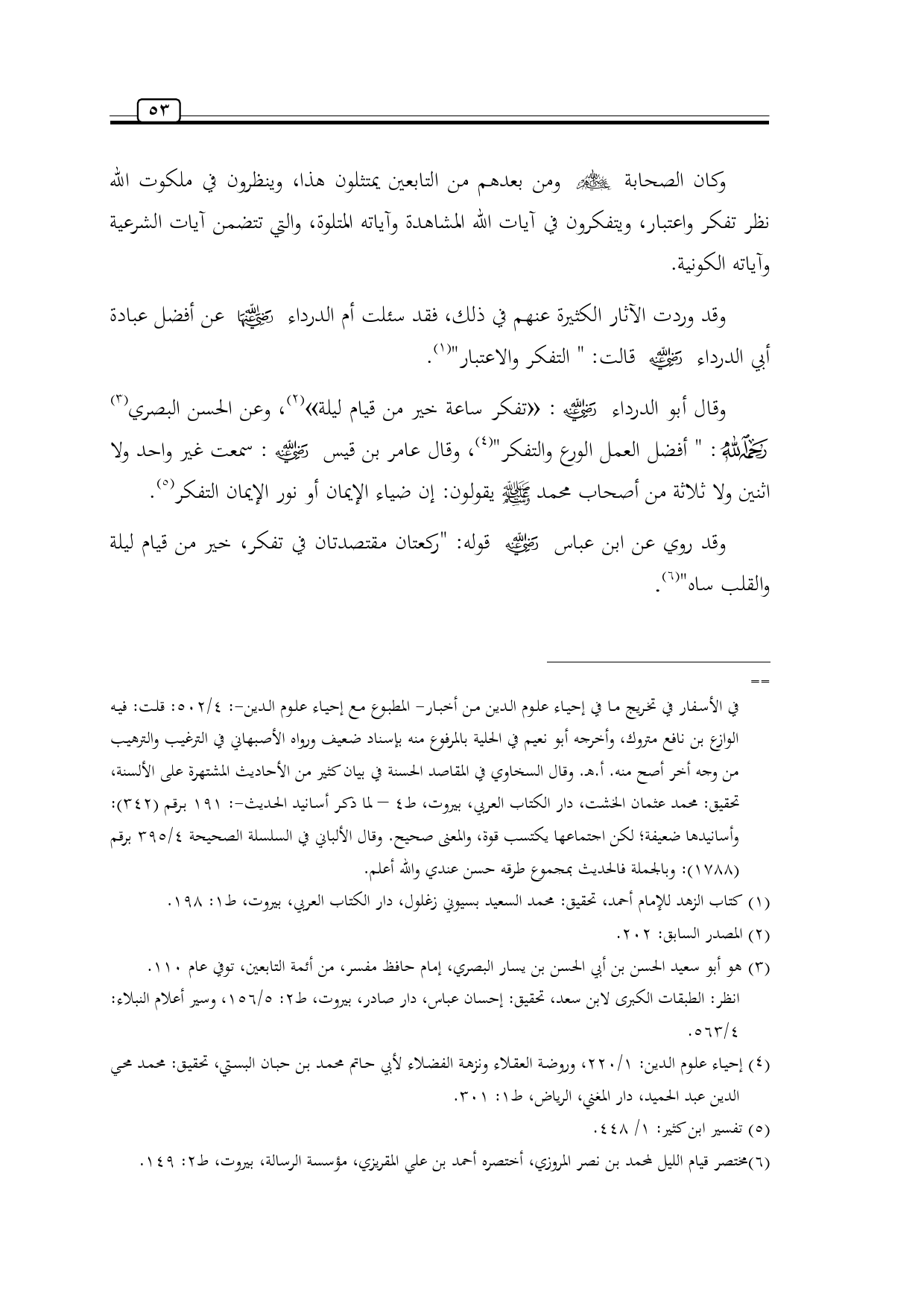 وقال أبو الدرداء -رضي الله عنه-: «تفكر ساعة خير من قيام ليلة» (¬2)، وعن الحسن البصري (¬3) -رحمه الله-: " أفضل العمل الورع والتفكر" (¬4)، وقال عامر بن قيس -رضي الله عنه-: سمعت غير واحد ولا اثنين ولا ثلاثة من أصحاب محمد -صلى الله عليه وسلم- يقولون: إن ضياء الإيمان أو نور الإيمان التفكر (¬5).