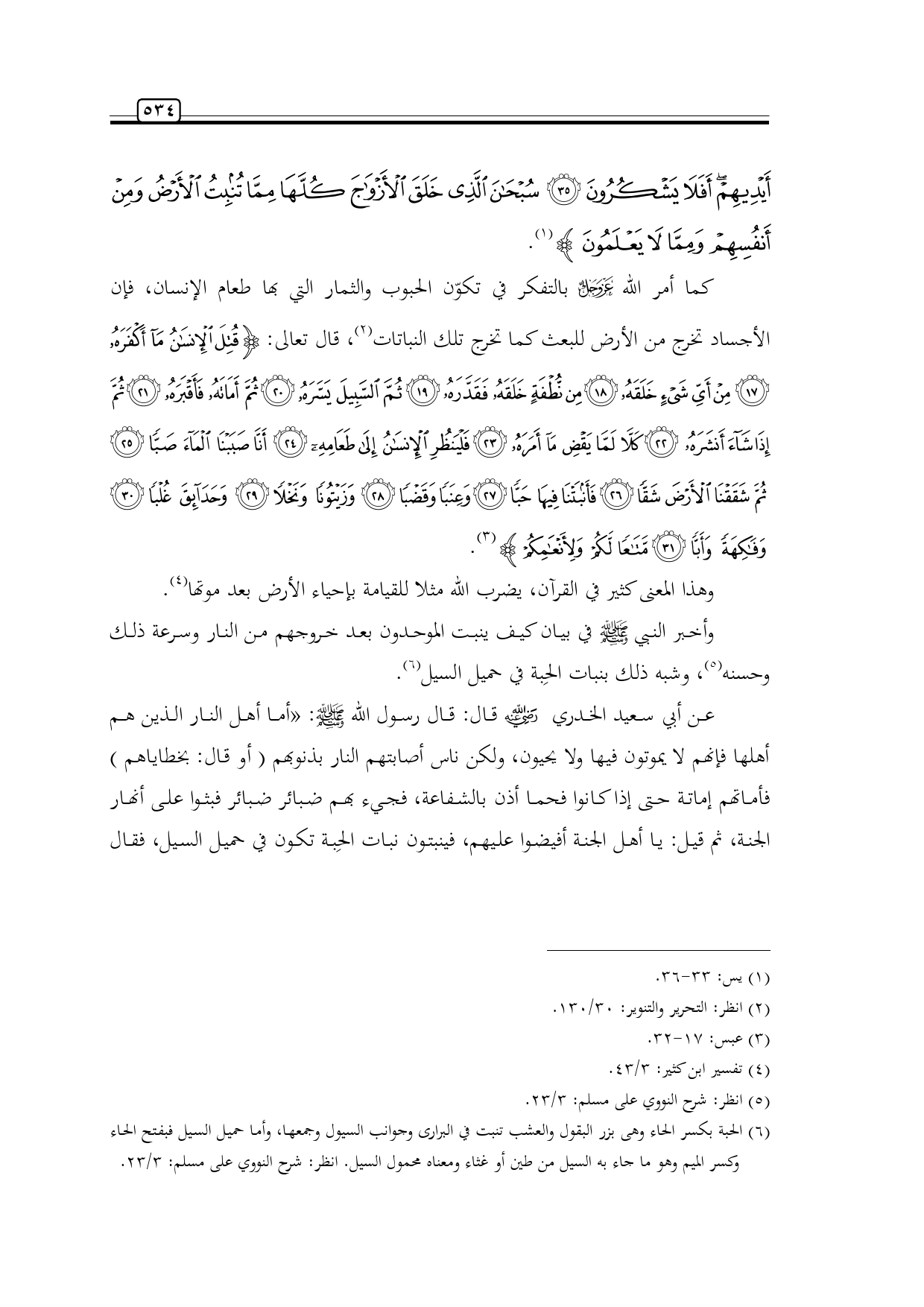 كما أمر الله -عز وجل- بالتفكر في تكوّن الحبوب والثمار التي بها طعام الإنسان، فإن الأجساد تخرج من الأرض للبعث كما تخرج تلك النباتات (¬2)، قال تعالى: {قُتِلَ الْإِنْسَانُ مَا أَكْفَرَهُ (17) مِنْ أَيِّ شَيْءٍ خَلَقَهُ (18) مِنْ نُطْفَةٍ خَلَقَهُ فَقَدَّرَهُ (19) ثُمَّ السَّبِيلَ يَسَّرَهُ (20) ثُمَّ أَمَاتَهُ فَأَقْبَرَهُ (21) ثُمَّ إِذَا شَاءَ أَنْشَرَهُ (22) كَلَّا لَمَّا يَقْضِ مَا أَمَرَهُ (23) فَلْيَنْظُرِ الْإِنْسَانُ إِلَى طَعَامِهِ (24) أَنَّا صَبَبْنَا الْمَاءَ صَبًّا (25) ثُمَّ شَقَقْنَا الْأَرْضَ شَقًّا (26) فَأَنْبَتْنَا فِيهَا حَبًّا (27) وَعِنَبًا وَقَضْبًا (28) وَزَيْتُونًا وَنَخْلًا (29) وَحَدَائِقَ غُلْبًا (30) وَفَاكِهَةً وَأَبًّا (31) مَتَاعًا لَكُمْ وَلِأَنْعَامِكُمْ} (¬3).