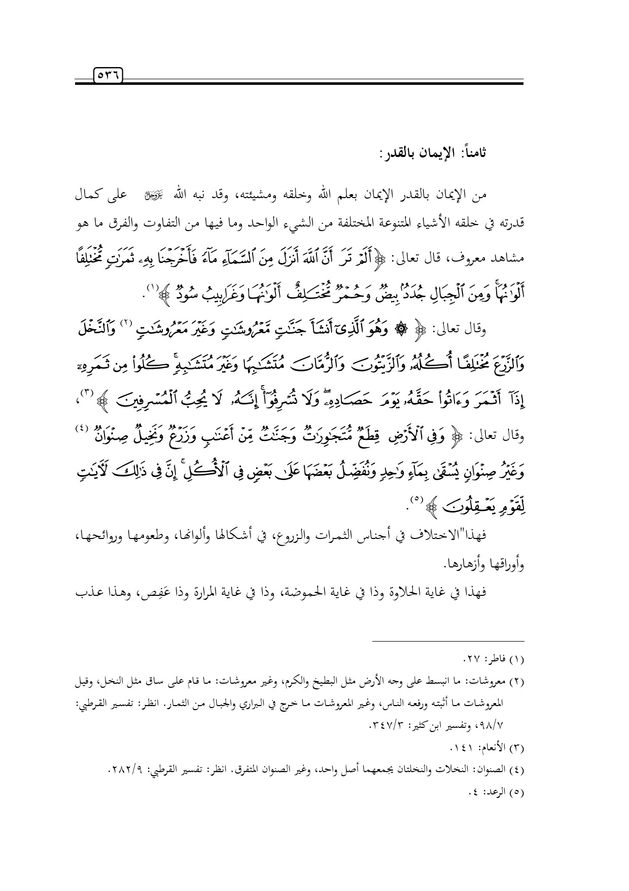 من الإيمان بالقدر الإيمان بعلم الله وخلقه ومشيئته، وقد نبه الله -عز وجل- على كمال قدرته في خلقه الأشياء المتنوعة المختلفة من الشيء الواحد وما فيها من التفاوت والفرق ما هو مشاهد معروف، قال تعالى: {أَلَمْ تَرَ أَنَّ اللَّهَ أَنْزَلَ مِنَ السَّمَاءِ مَاءً فَأَخْرَجْنَا بِهِ ثَمَرَاتٍ مُخْتَلِفًا أَلْوَانُهَا وَمِنَ الْجِبَالِ جُدَدٌ بِيضٌ وَحُمْرٌ مُخْتَلِفٌ أَلْوَانُهَا وَغَرَابِيبُ سُودٌ} (¬1).