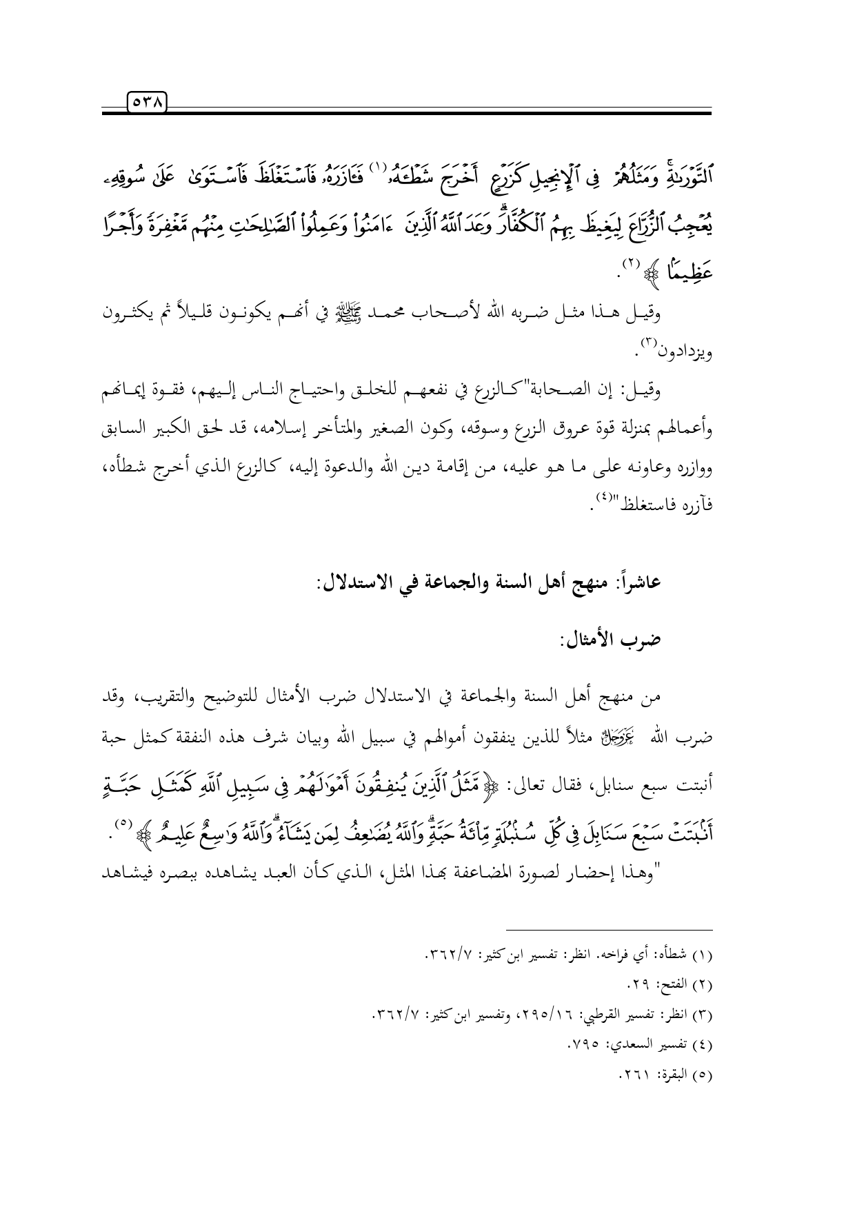 من منهج أهل السنة والجماعة في الاستدلال ضرب الأمثال للتوضيح والتقريب، وقد ضرب الله -عز وجل- مثلاً للذين ينفقون أموالهم في سبيل الله وبيان شرف هذه النفقة كمثل حبة أنبتت سبع سنابل، فقال تعالى: {مَثَلُ الَّذِينَ يُنْفِقُونَ أَمْوَالَهُمْ فِي سَبِيلِ اللَّهِ كَمَثَلِ حَبَّةٍ أَنْبَتَتْ سَبْعَ سَنَابِلَ فِي كُلِّ سُنْبُلَةٍ مِائَةُ حَبَّةٍ وَاللَّهُ يُضَاعِفُ لِمَنْ يَشَاءُ وَاللَّهُ وَاسِعٌ عَلِيمٌ} (¬5).