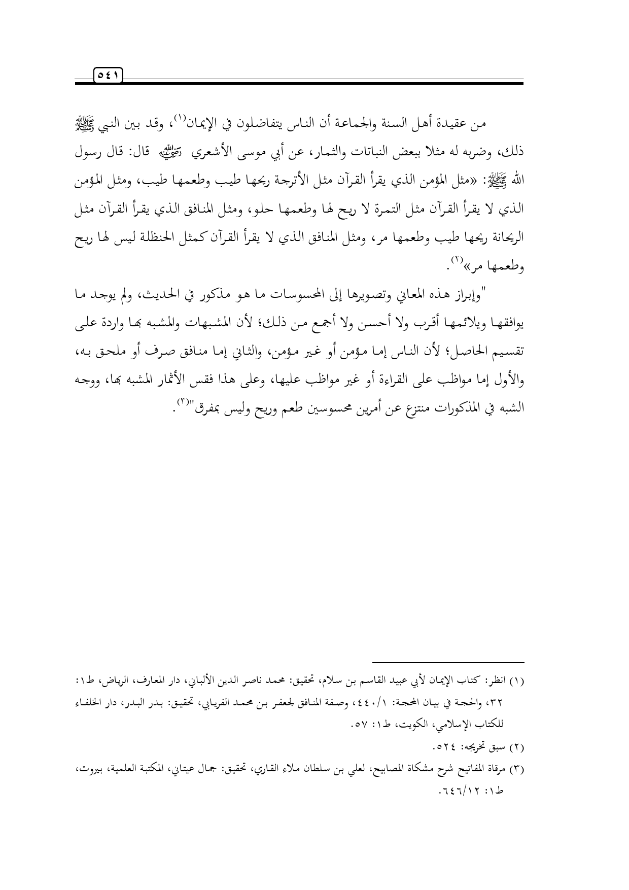 من عقيدة أهل السنة والجماعة أن الناس يتفاضلون في الإيمان (¬1)، وقد بين النبي -صلى الله عليه وسلم- ذلك، وضربه له مثلا ببعض النباتات والثمار، عن أبي موسى الأشعري -رضي الله عنه- قال: قال رسول الله -صلى الله عليه وسلم-: «مثل المؤمن الذي يقرأ القرآن مثل الأترجة ريحها طيب وطعمها طيب، ومثل المؤمن الذي لا يقرأ القرآن مثل التمرة لا ريح لها وطعمها حلو، ومثل المنافق الذي يقرأ القرآن مثل الريحانة ريحها طيب وطعمها مر، ومثل المنافق الذي لا يقرأ القرآن كمثل الحنظلة ليس لها ريح وطعمها مر» (¬2).