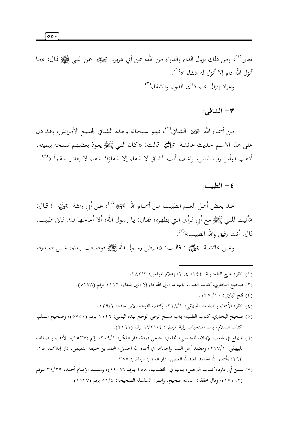 عد بعض أهل العلم الطبيب من أسماء الله -عز وجل- (¬6)، عن أبي رمثة -رضي الله عنه-؛ قال: «أتيت للنبي -صلى الله عليه وسلم- مع أبي فرأى التي بظهره، فقال: يا رسول الله، ألا أعالجها لك فإني طبيب، قال: أنت رفيق والله الطبيب» (¬7).