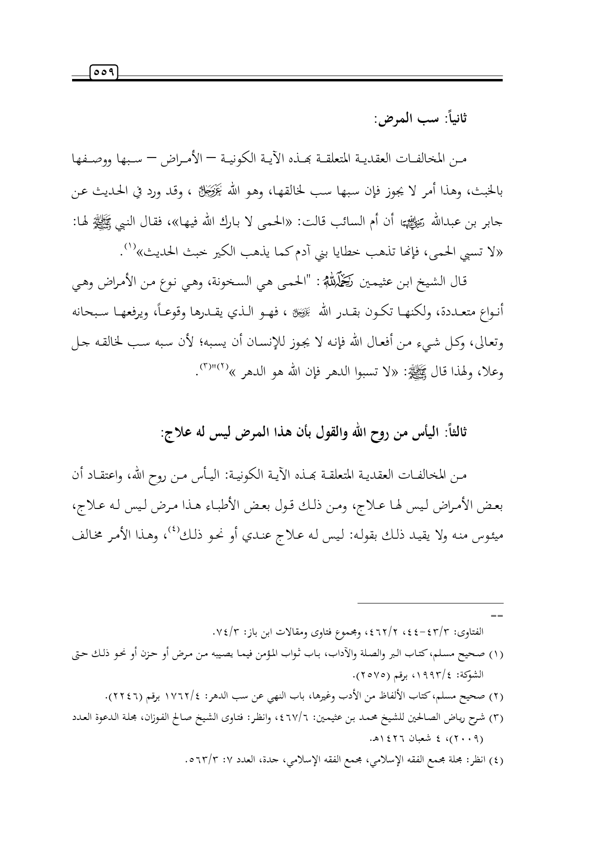 من المخالفات العقدية المتعلقة بهذه الآية الكونية: اليأس من روح الله، واعتقاد أن بعض الأمراض ليس لها علاج، ومن ذلك قول بعض الأطباء هذا مرض ليس له علاج، ميئوس منه ولا يقيد ذلك بقوله: ليس له علاج عندي أو نحو ذلك (¬4)، وهذا الأمر مخالف