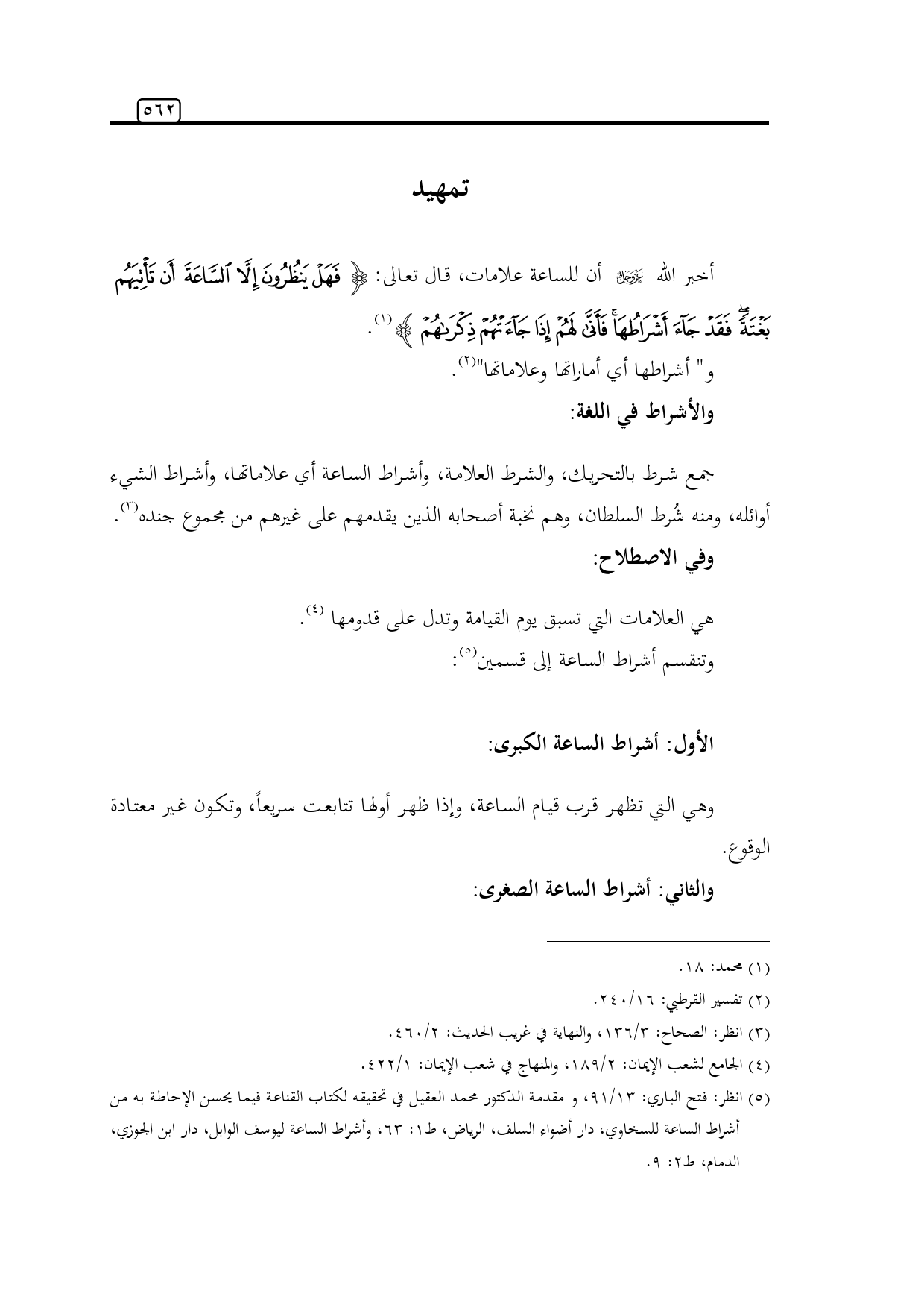 (¬5) انظر: فتح الباري: 13/ 91، ومقدمة الدكتور محمد العقيل في تحقيقه لكتاب القناعة فيما يحسن الإحاطة به من أشراط الساعة للسخاوي، دار أضواء السلف، الرياض، ط1: 63، وأشراط الساعة ليوسف الوابل، دار ابن الجوزي، الدمام، ط2: 9.