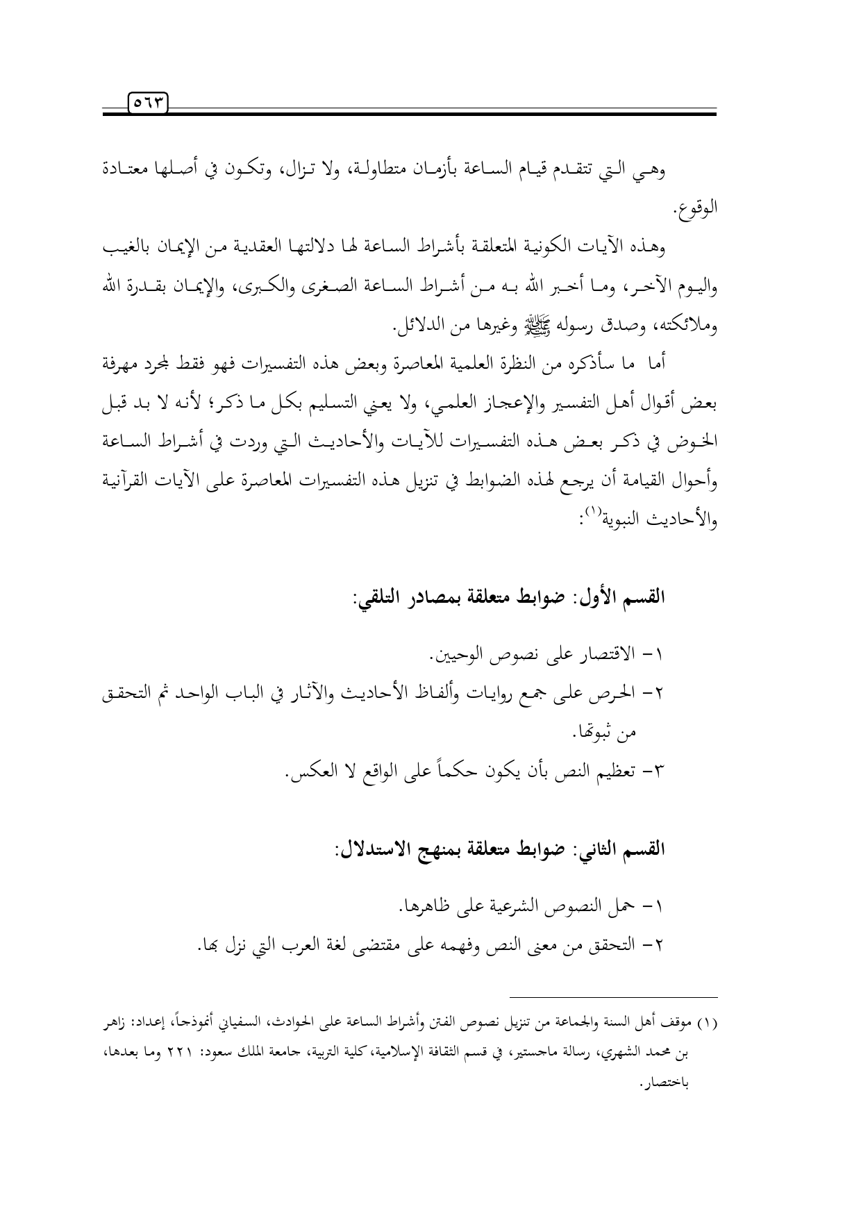 أما ما سأذكره من النظرة العلمية المعاصرة وبعض هذه التفسيرات فهو فقط لمجرد مهرفة بعض أقوال أهل التفسير والإعجاز العلمي، ولا يعني التسليم بكل ما ذكر؛ لأنه لا بد قبل الخوض في ذكر بعض هذه التفسيرات للآيات والأحاديث التي وردت في أشراط الساعة وأحوال القيامة أن يرجع لهذه الضوابط في تنزيل هذه التفسيرات المعاصرة على الآيات القرآنية والأحاديث النبوية (¬1):