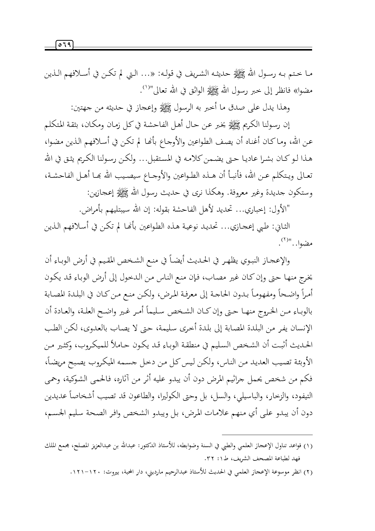 الثاني: طبي إعجازي ... تحديد نوعية هذه الطواعين بأنها لم تكن في أسلافهم الذين مضوا .. " (¬2).